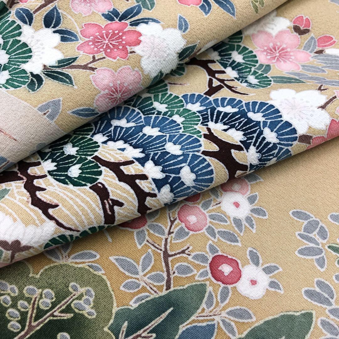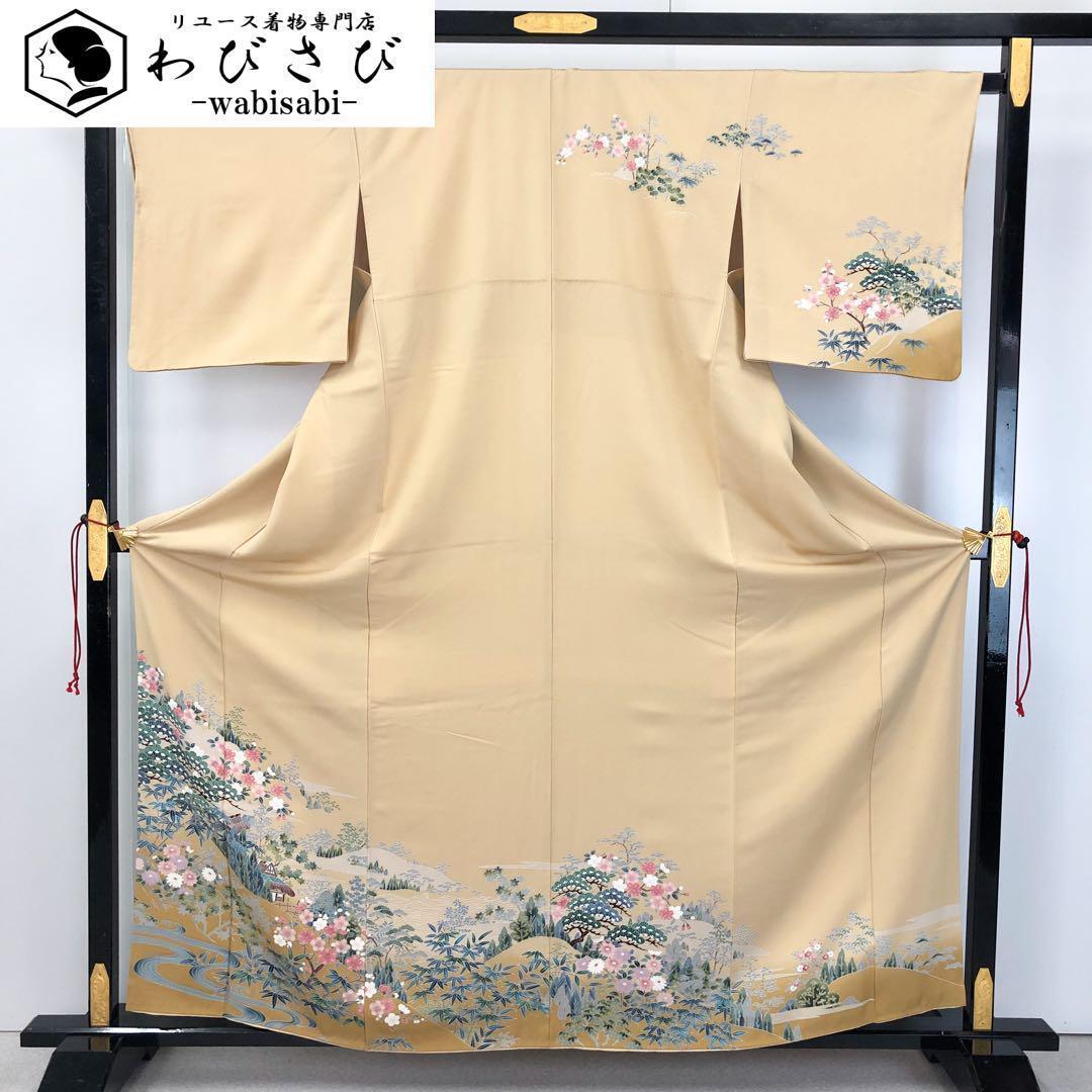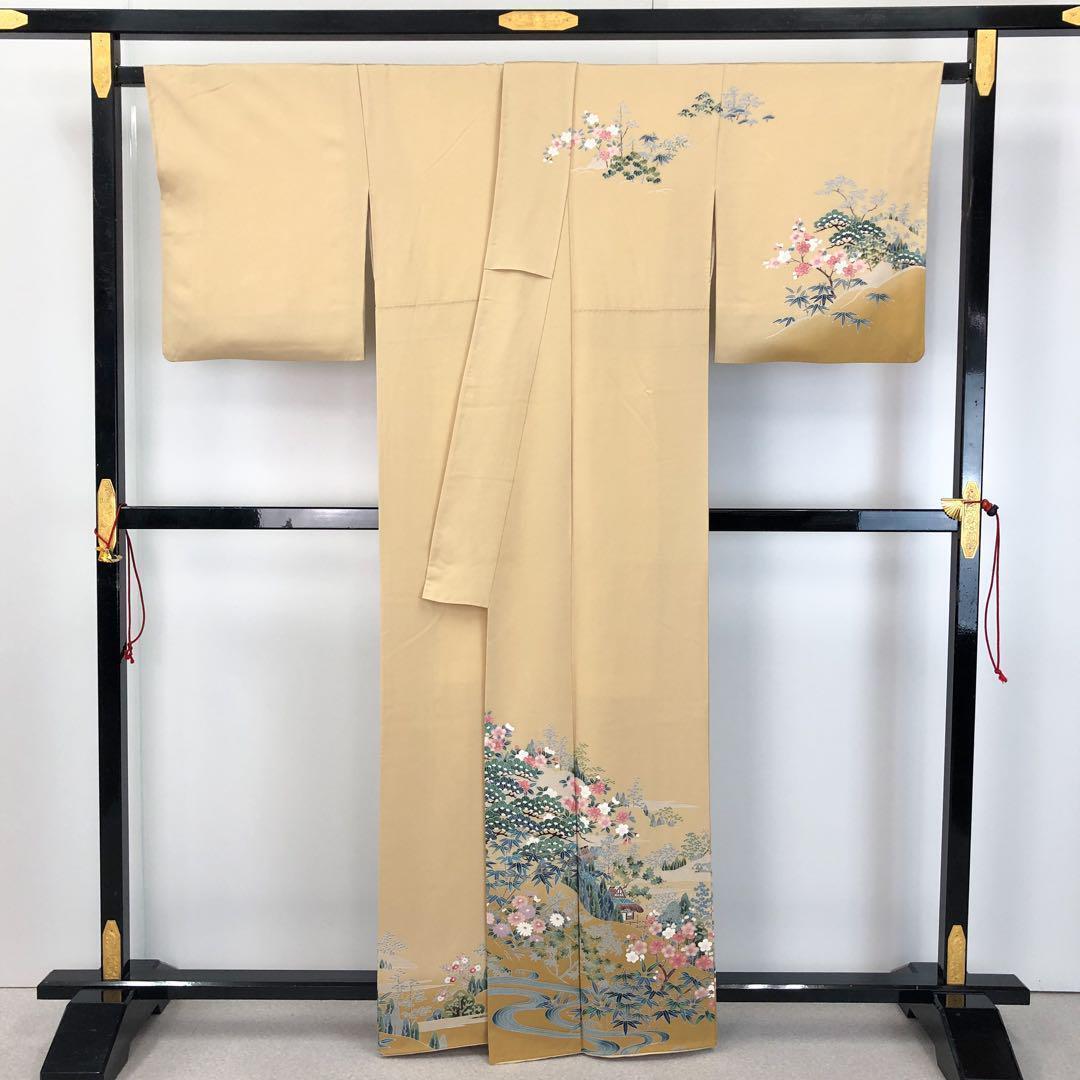 鳥の子色のお色味に松竹梅や流水模様などの友禅の美しい柄裄がデザインされた素敵なお品でございます。