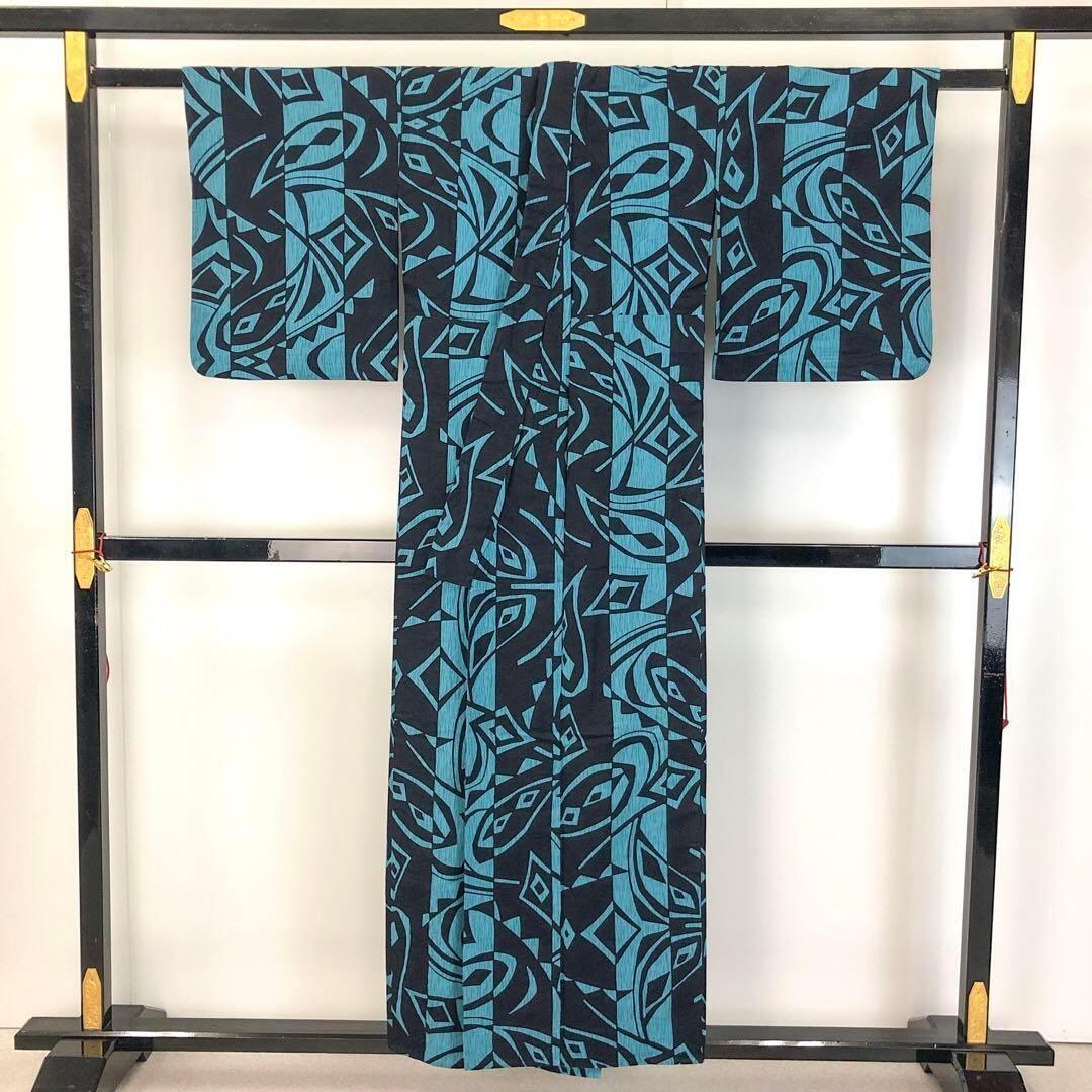 花浅葱色のお色味に縦縞に抽象模様がデザインされた素敵な柄裄のお品でございます。