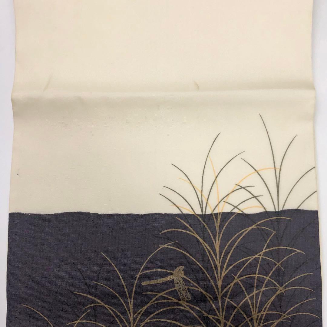 魚子黄色ベースのお色味に横縞模様、蜻蛉に草模様の柄裄がデザインされた風流な雰囲気のお品でございます。