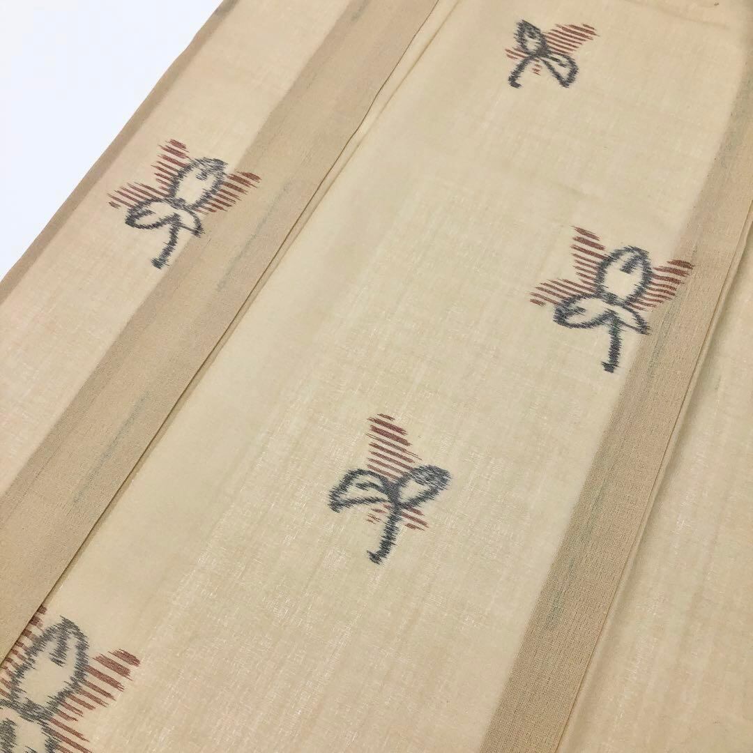枯野色の落ち着いたお色味に抽象柄がデザインされた透け感のある紗紬の雰囲気の良い素敵なお品でございます。
