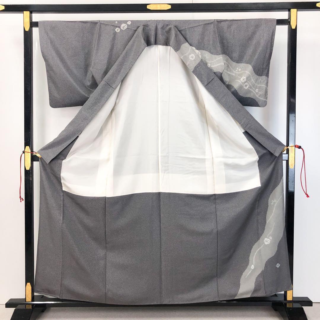 燻銀色の落ち着きのあるお色味に叩き染、絞りの雪輪、流水、花模様の柄裄がデザインされた雰囲気の良い素敵なお品でございます。