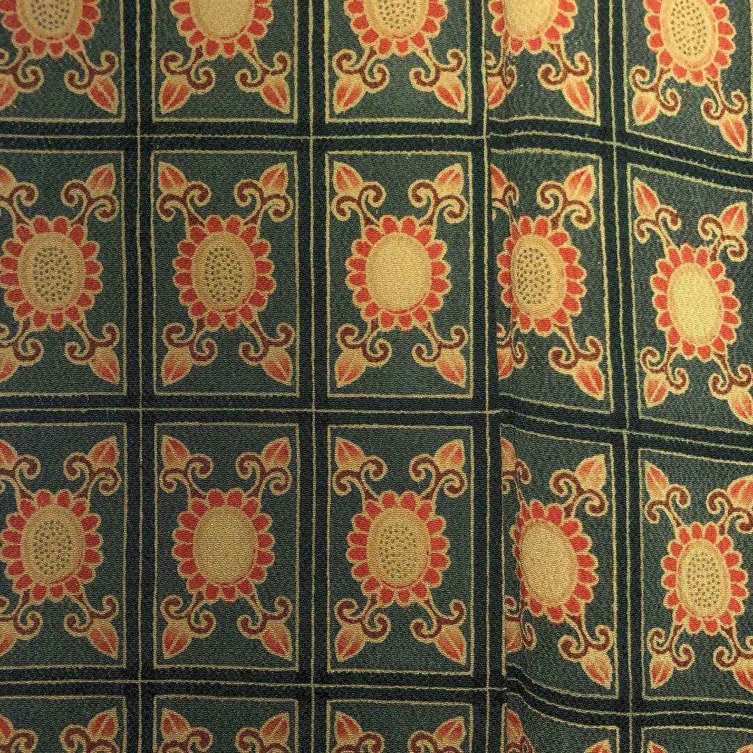 島松鼠色ベースの縮緬、格子柄に向日葵のような花模様がデザインされた型染の雰囲気の良いお品でございます。