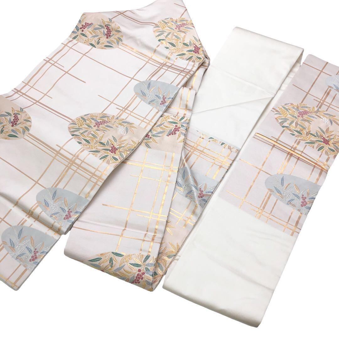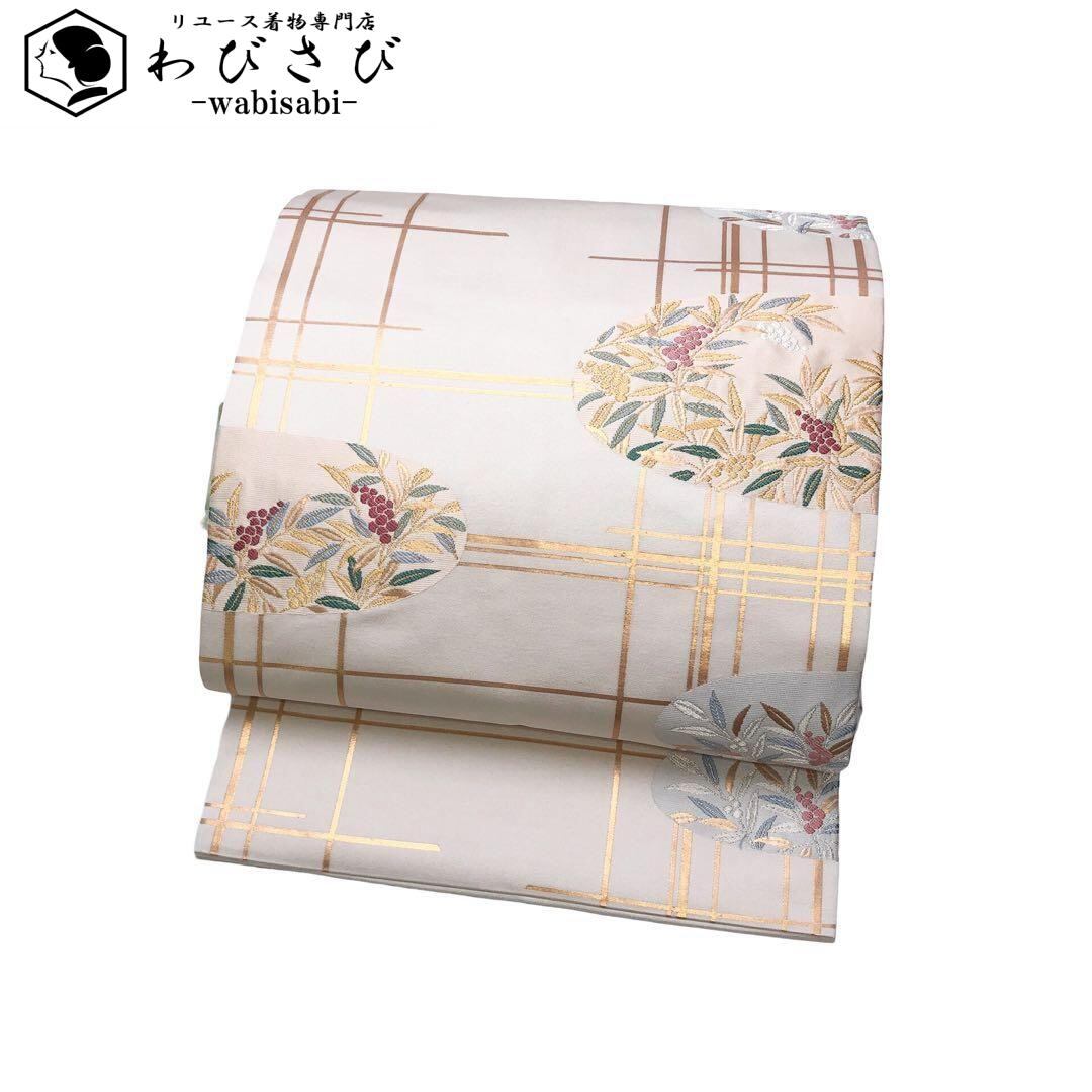 名古屋帯 南天の花模様 薄桜色 金銀糸 O-4920 着物 きもの kimono 和服 和装 中古 リサイクル着物 【送料無料】