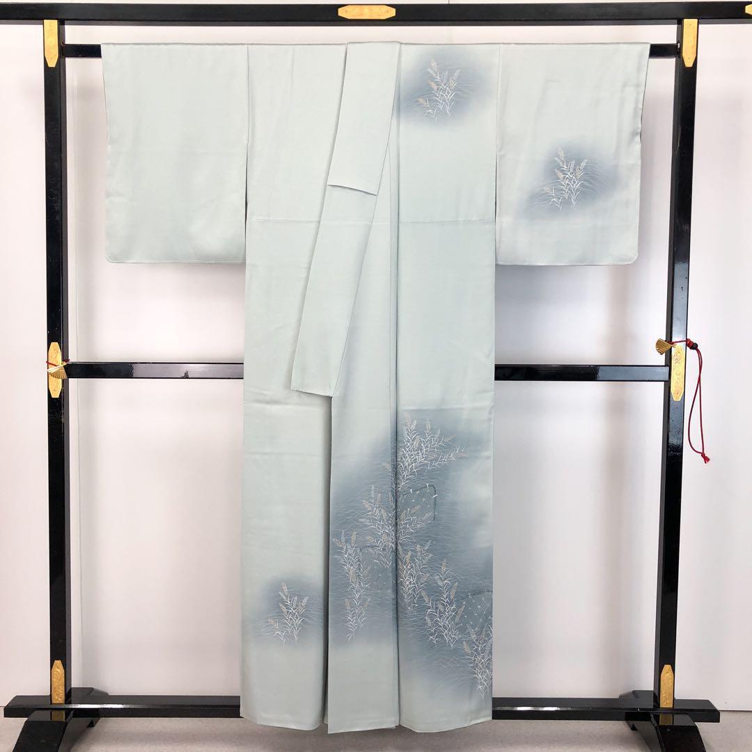 青白磁色の上品なお色味に竹垣、草花模様の柄裄がデザインされた品のある素敵なお品でございます。