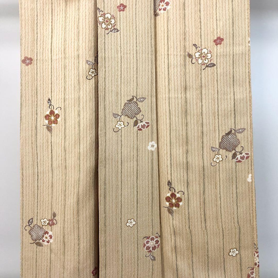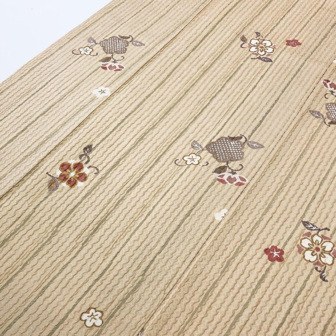 枯野色のお色味に縦縞模様、飛び柄の花柄がデザインされた素敵なお品でございます。
