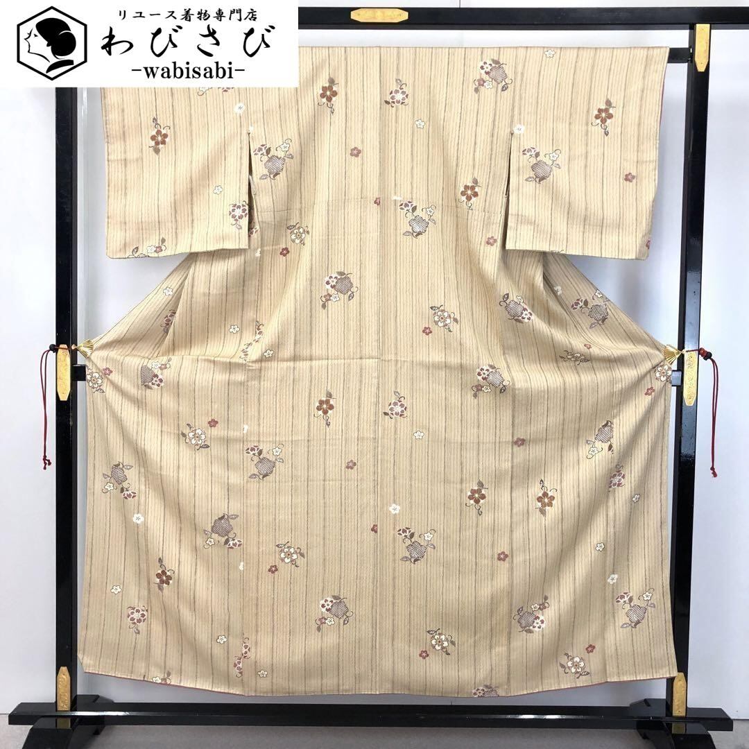 小紋 飛び柄 縦縞模様 花柄 金彩 しつけ糸 枯野色 K-4555 着物 きもの kimono 和服 和装 中古 リサイクル着物 【送料無料】