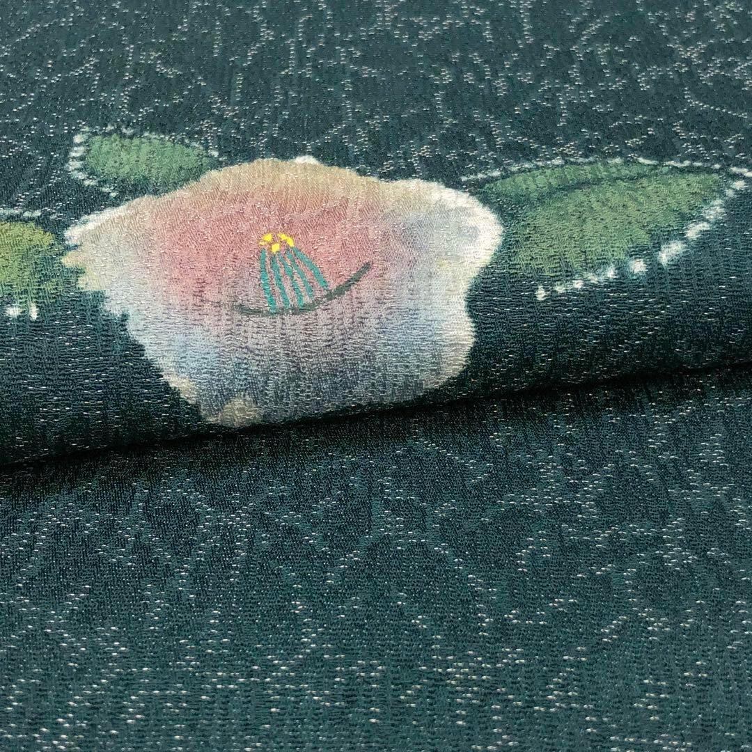 深藍色に銀通しされた品のある緑味のお色に手描きの椿の花模様がデザインされた素敵な柄裄のお品でございます。