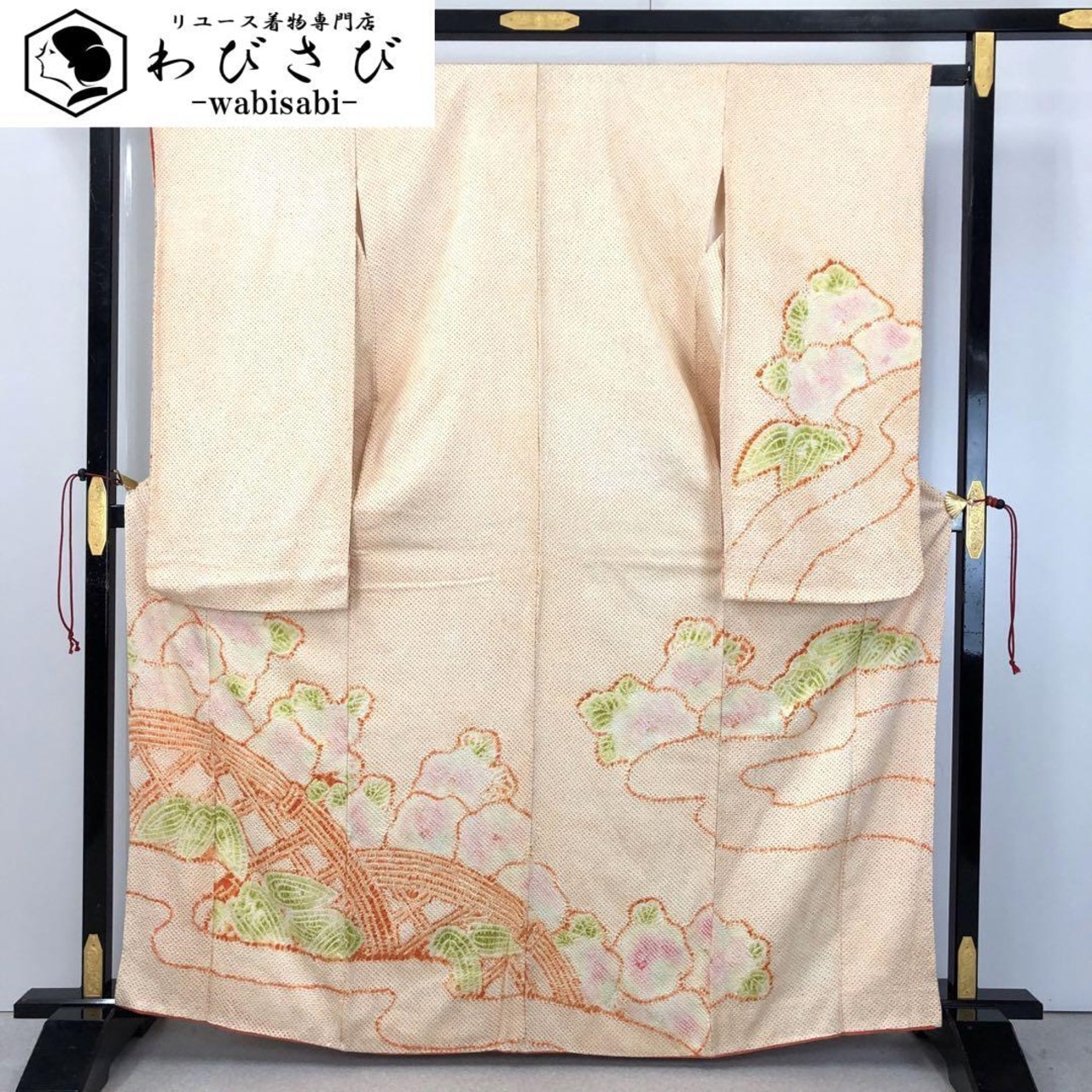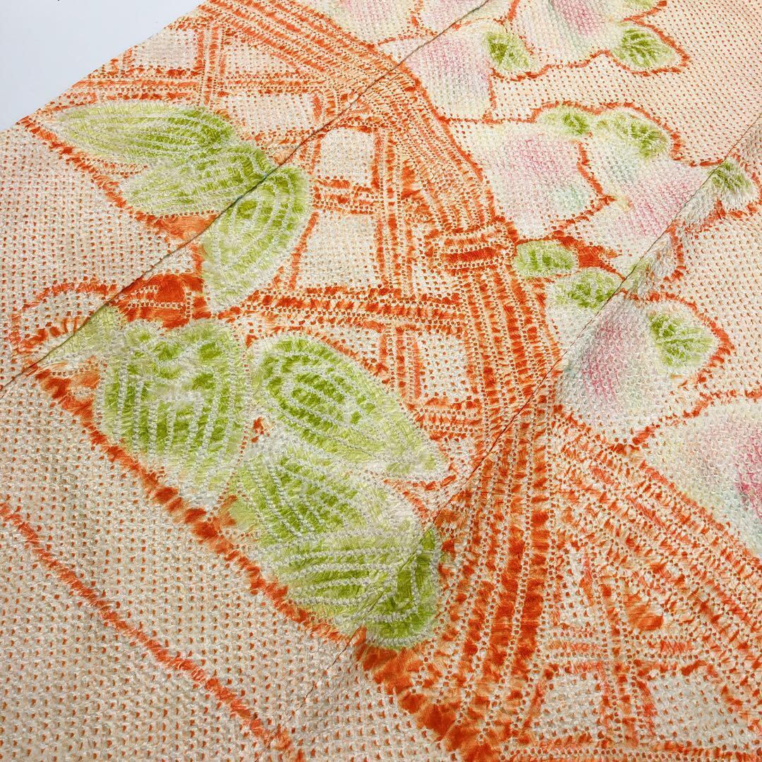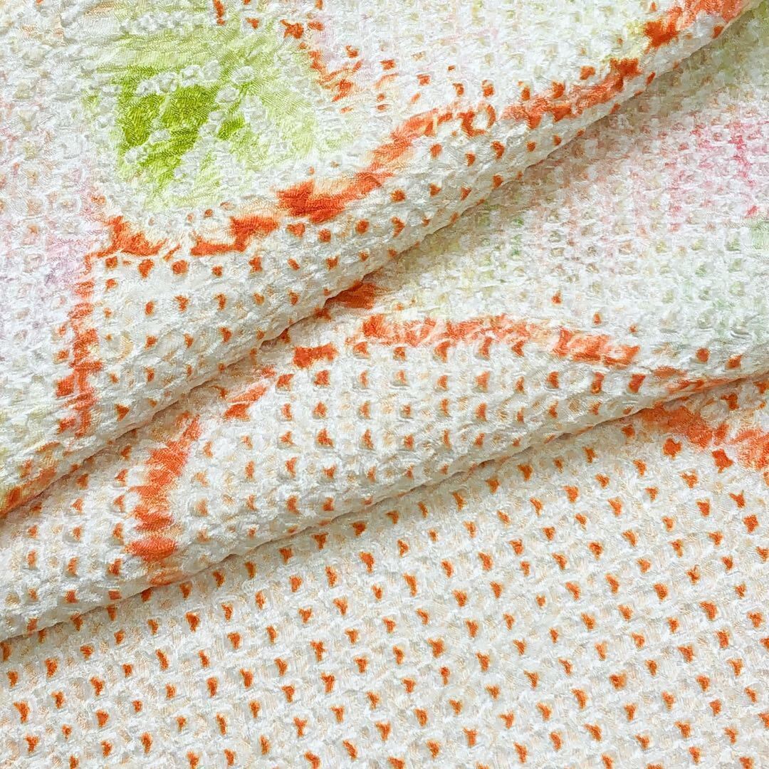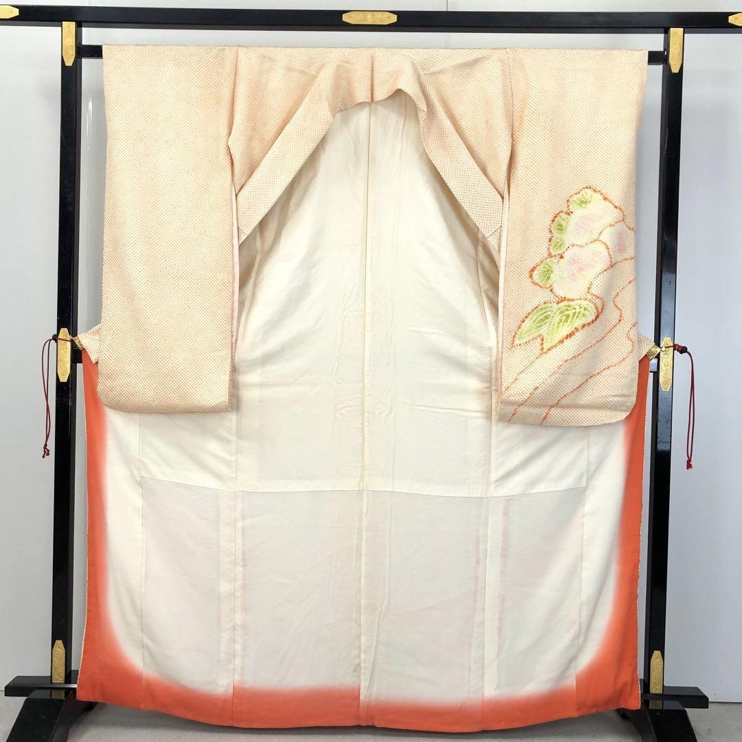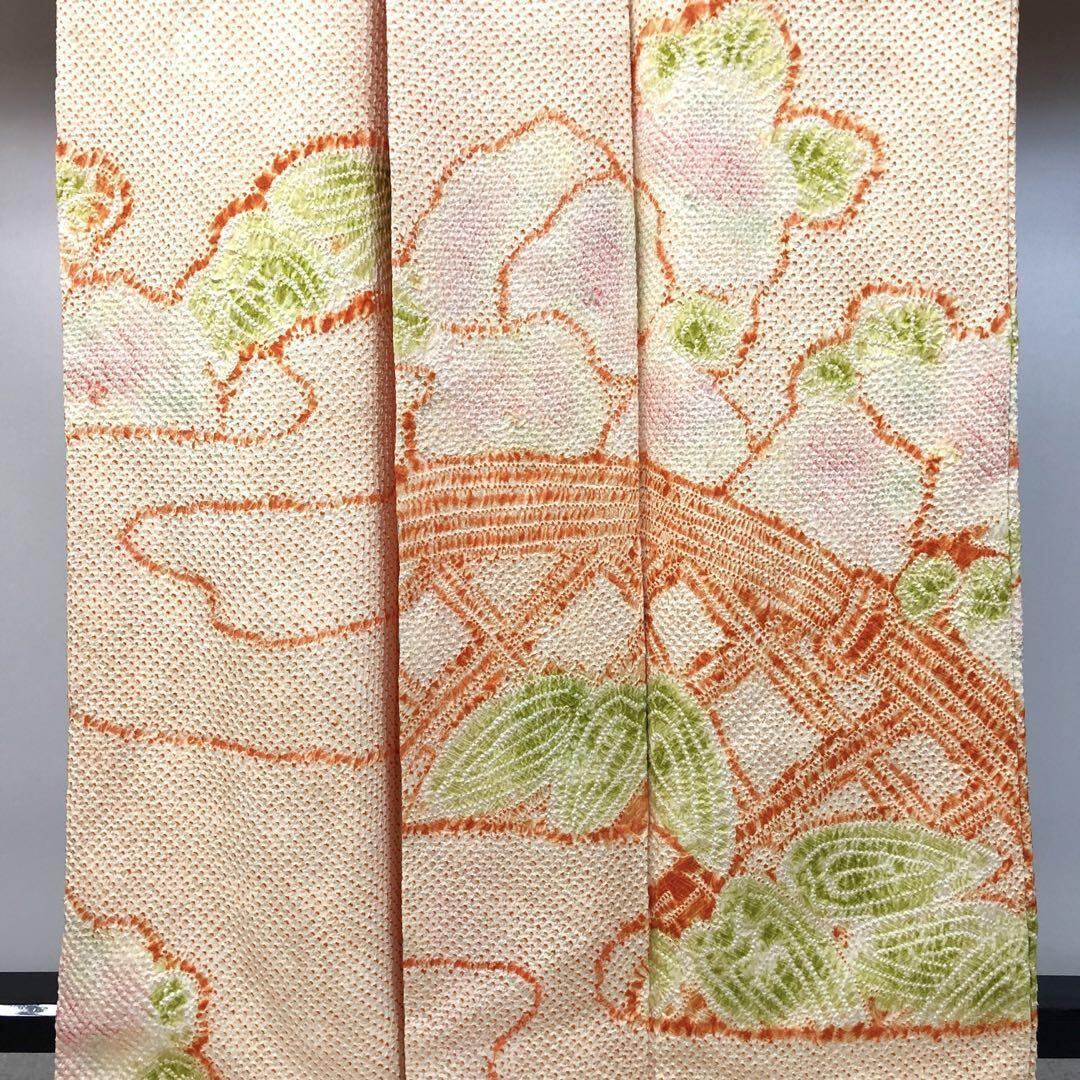 薄柑子色の淡い色彩のお色味に抽象花模様の柄裄がデザインされた素敵なお品でございます。