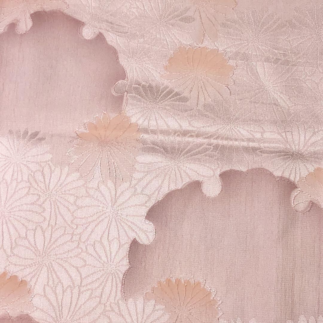 灰桃色のお色味に雪輪に菊の花模様がデザインされた品のある素敵な柄裄のお品でございます。