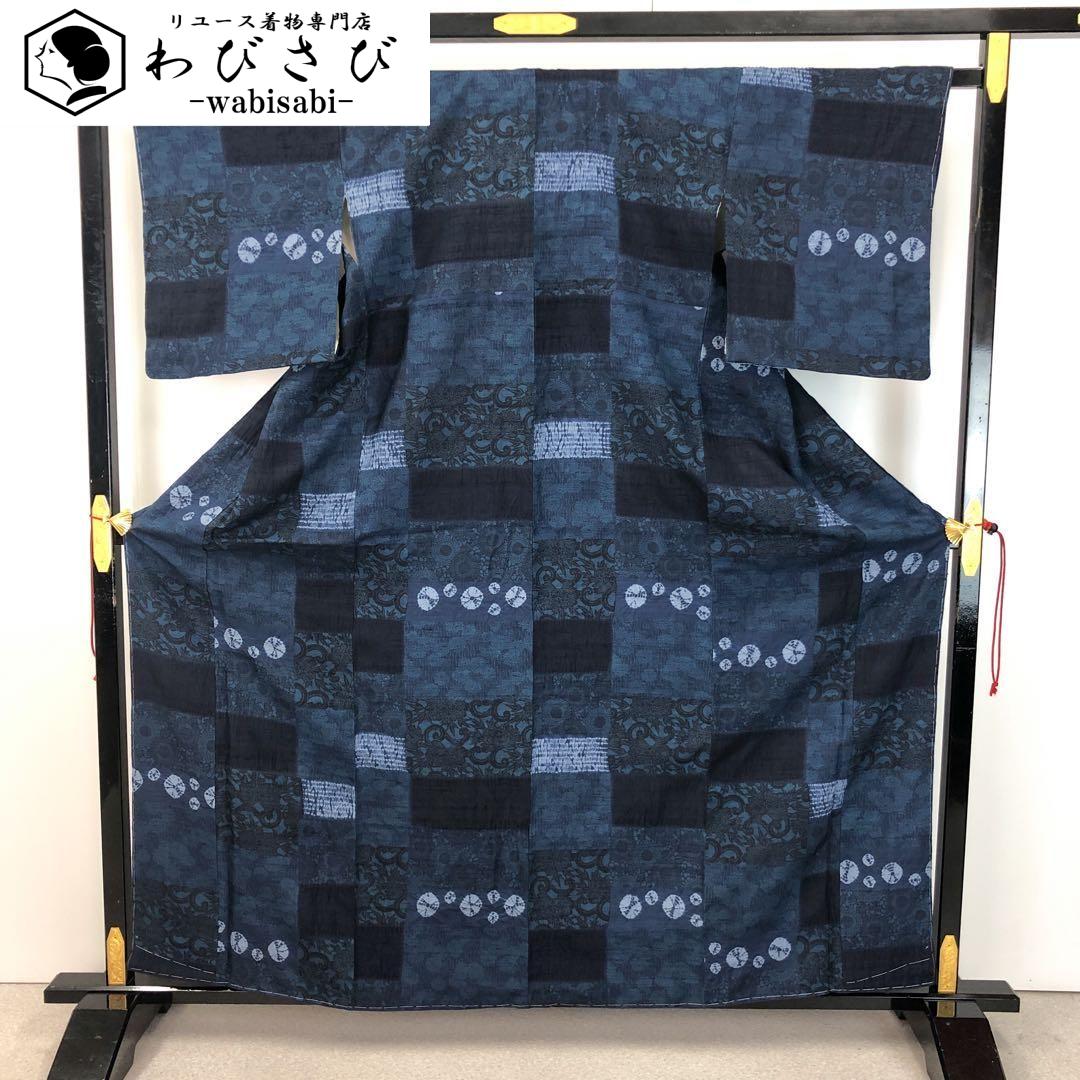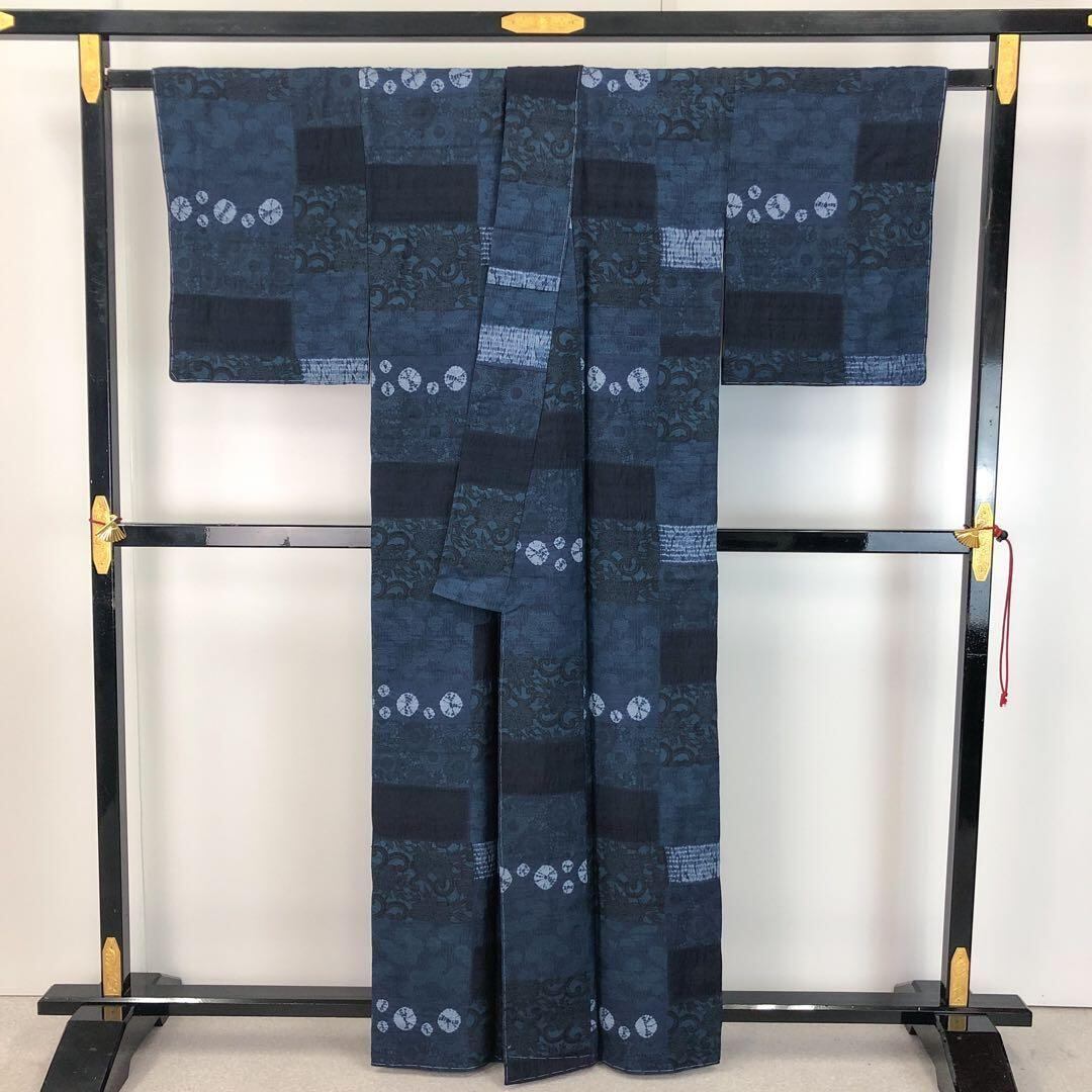 紬着物 絞り柄 型染 花柄模様 紺藍色 ますいわ屋 K-4537 着物 きもの kimono 和服 和装 中古 リサイクル着物 【送料無料】