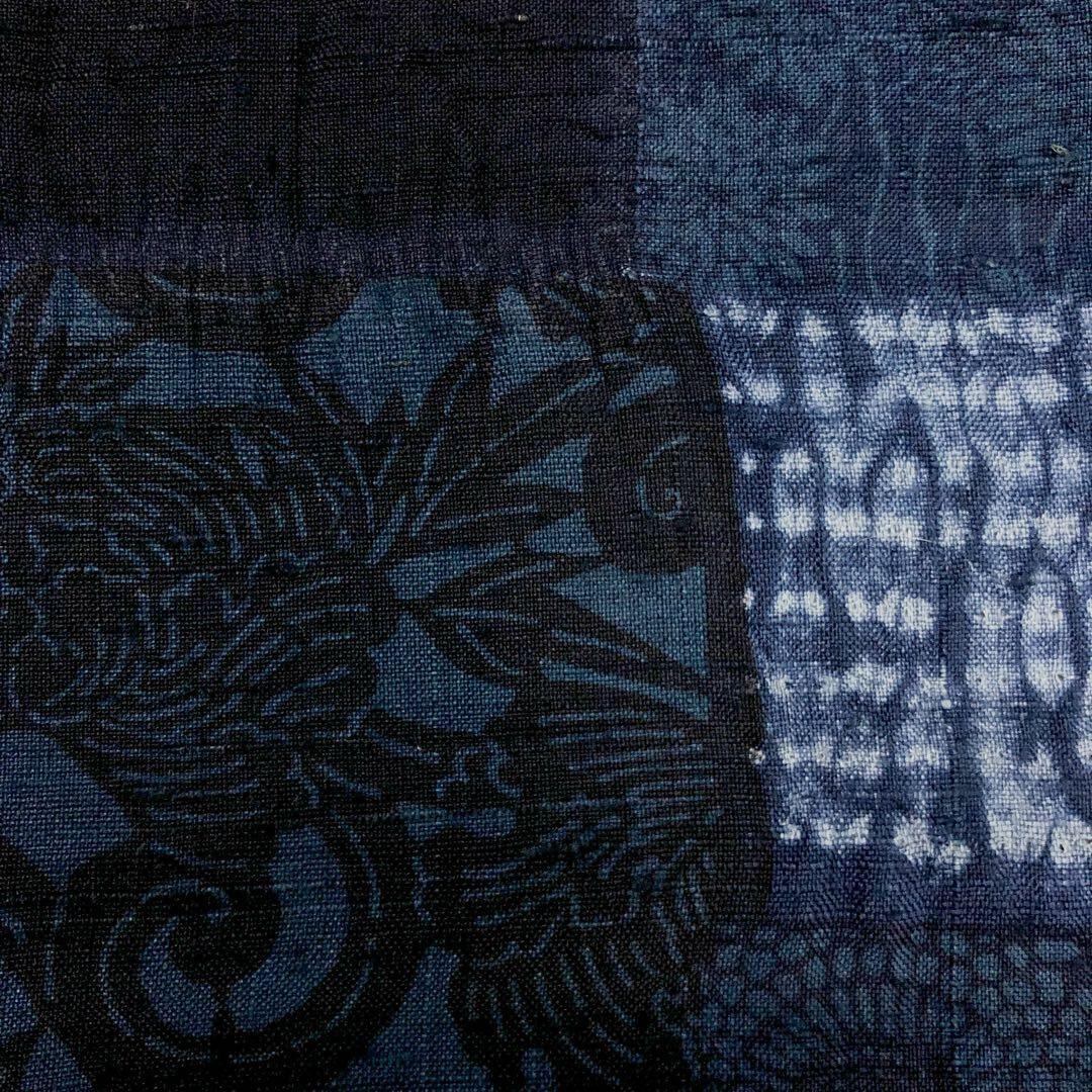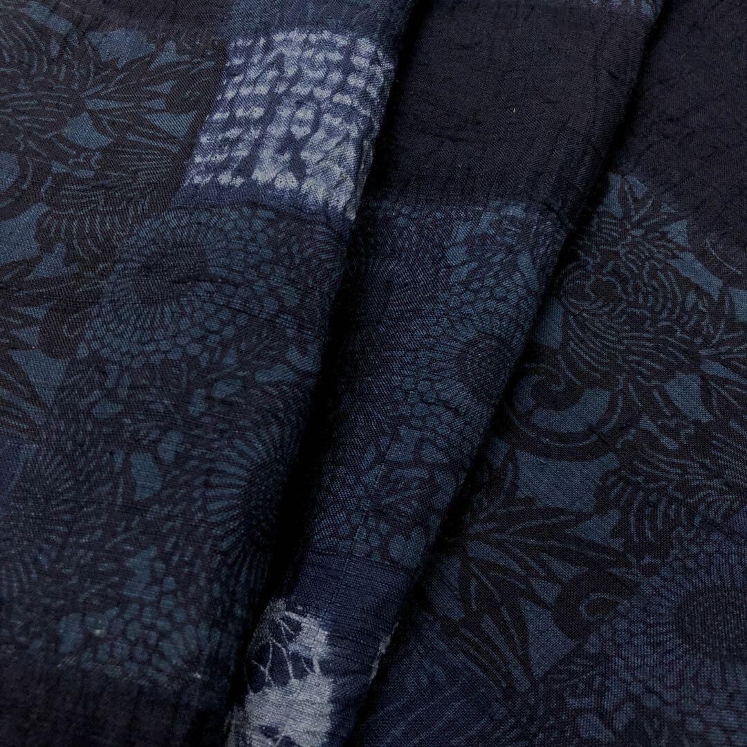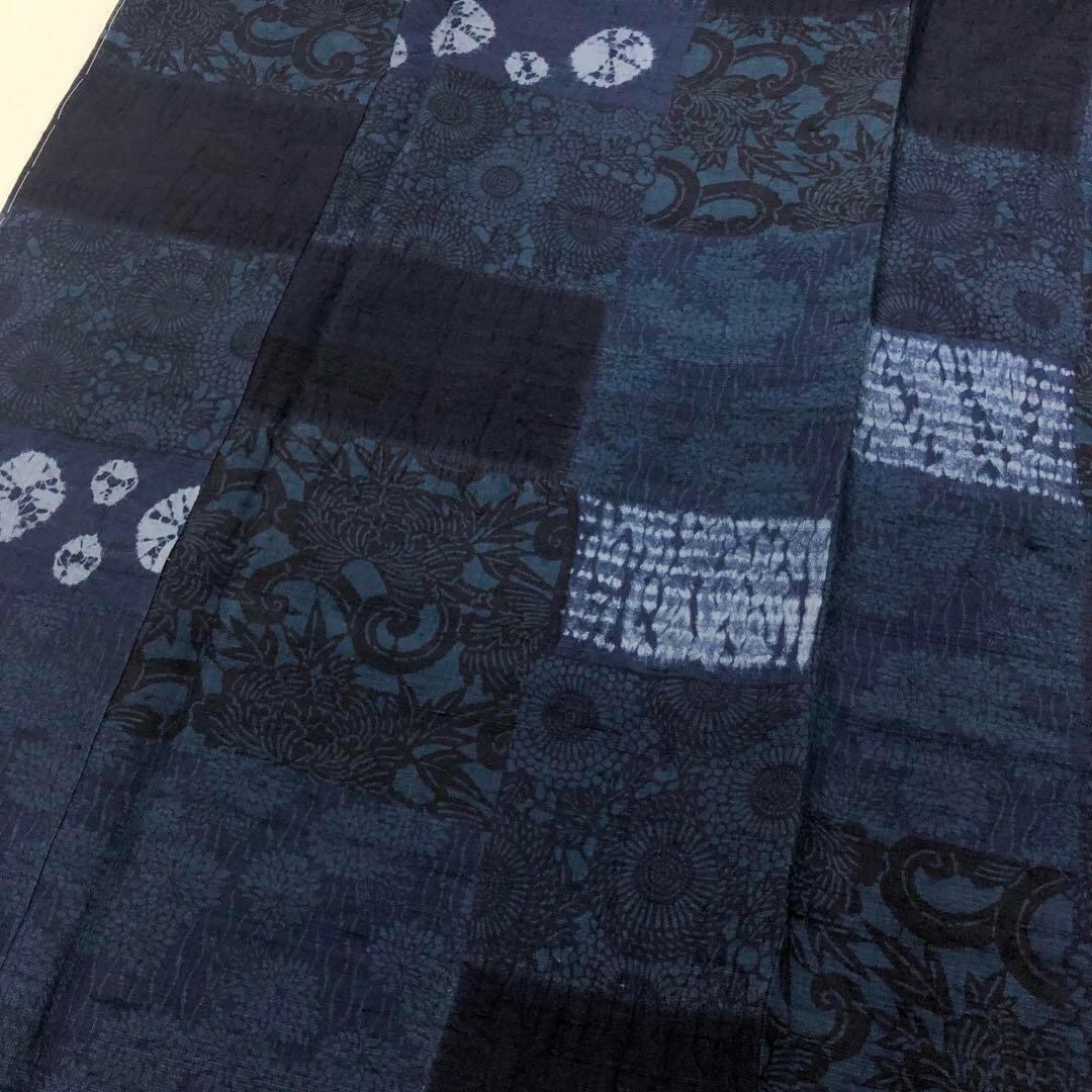 紺藍色の雰囲気の良い藍色に絞り柄、型染の花柄模様がデザインされた素敵な柄裄のお品でございます。