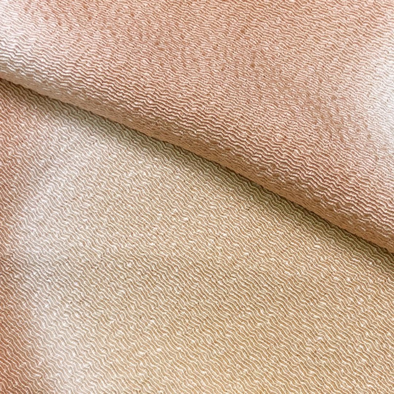 白茶色ベースのお色味に染め分けで曲線模様がデザインされた素敵な縮緬のお品でございます。