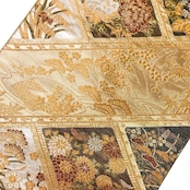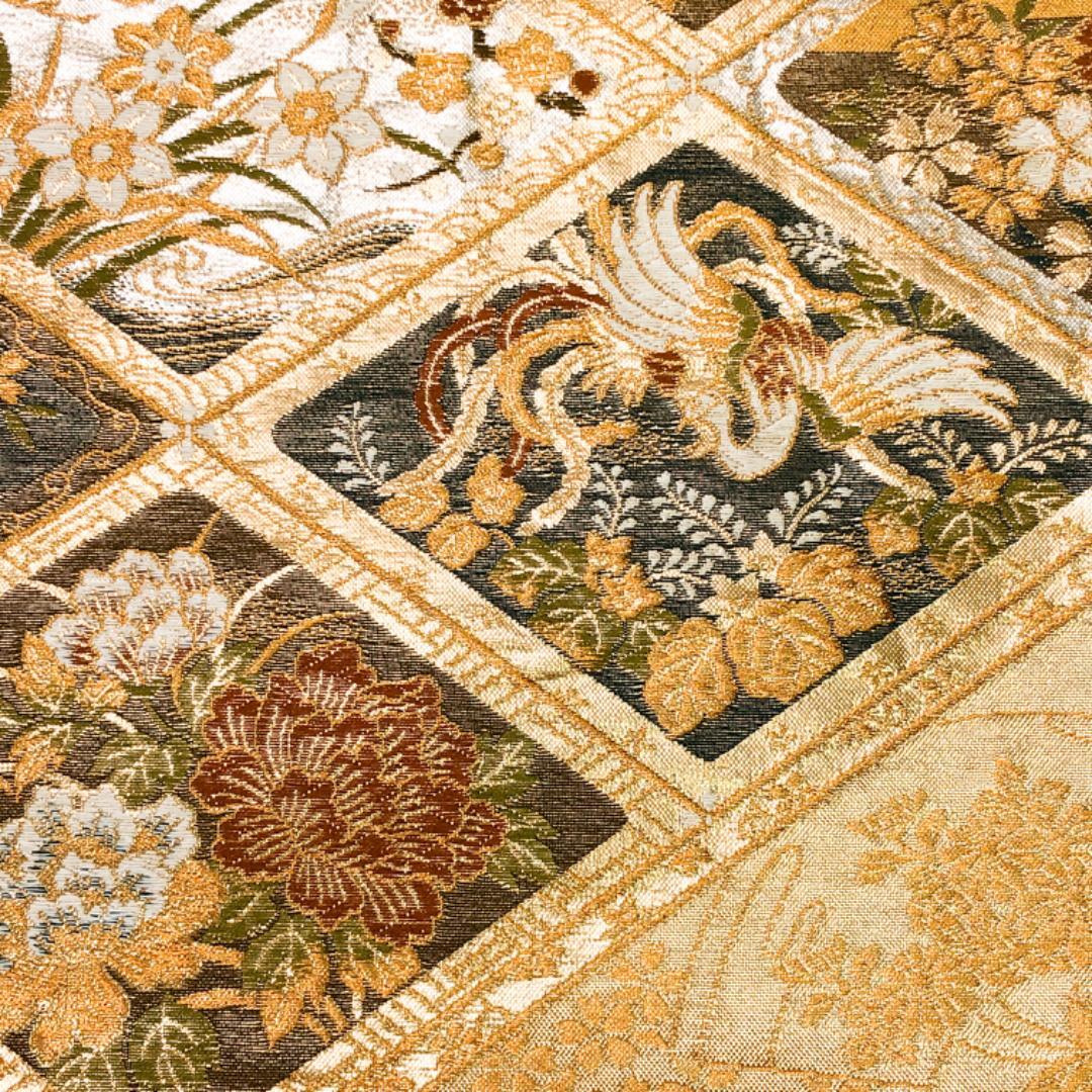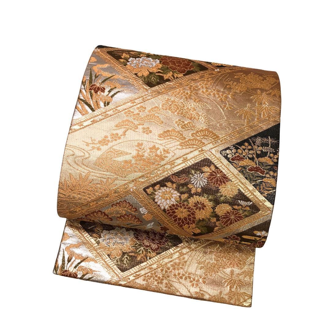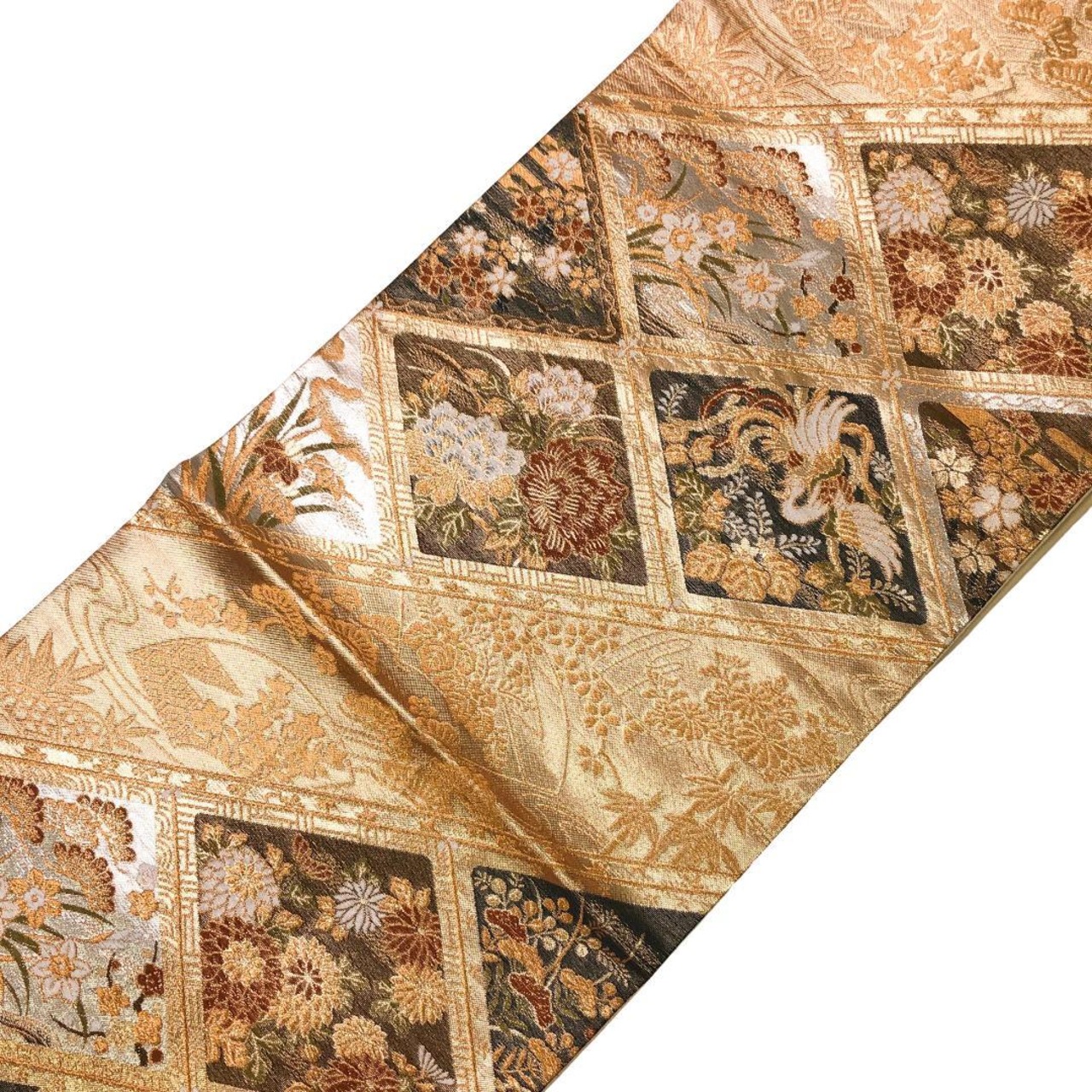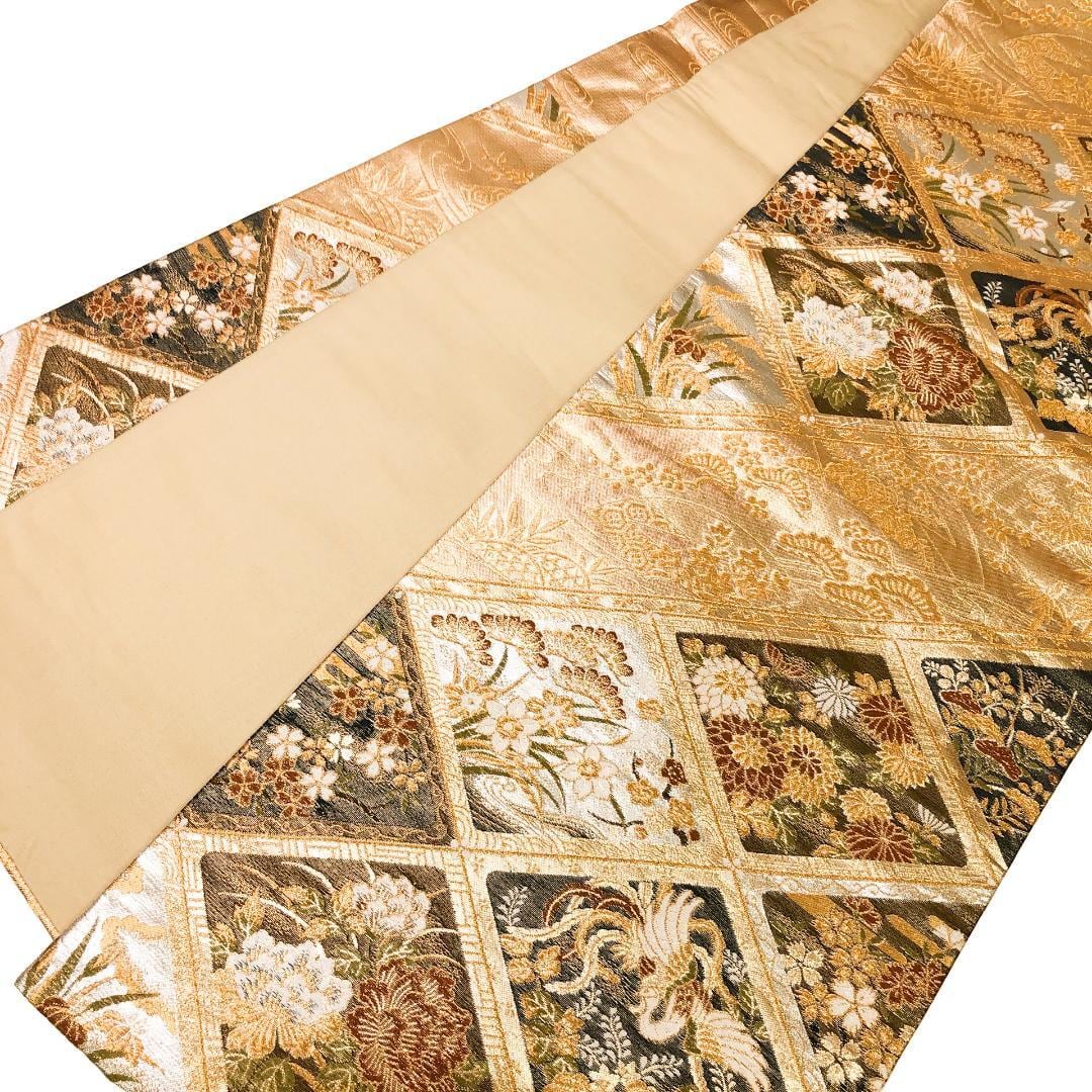 金色ベースの煌びやかなお色、菱形に四季の花模様,、松、鳥などの柄行がデザインされた素敵なお品でございます。