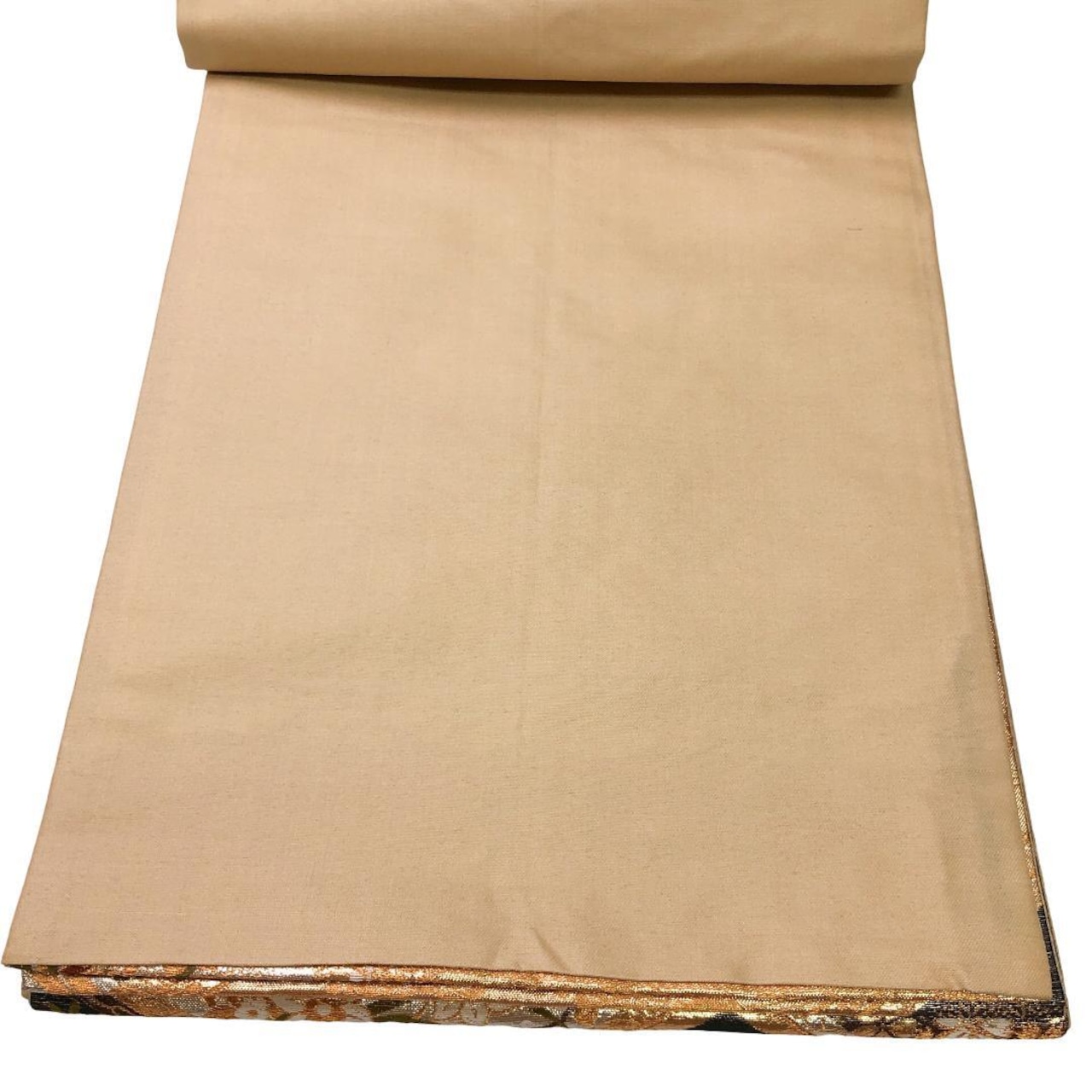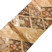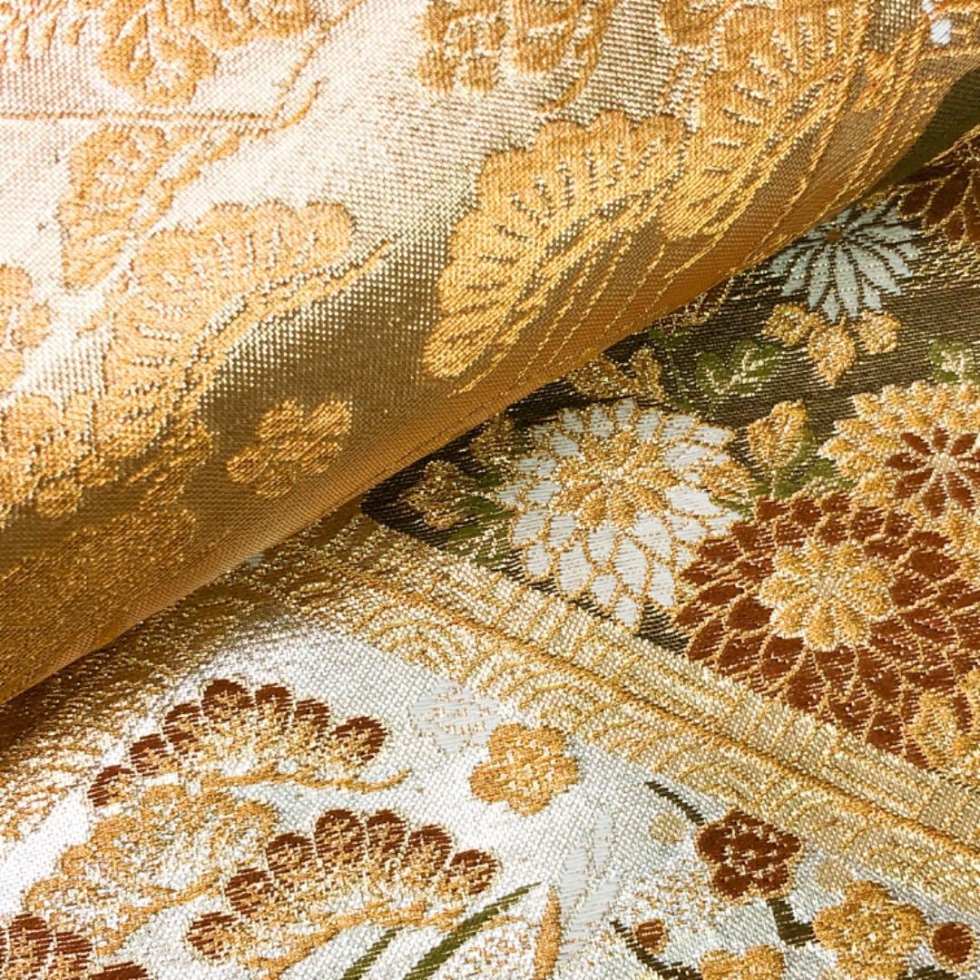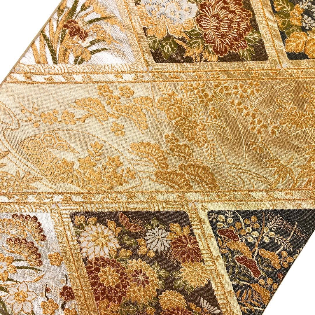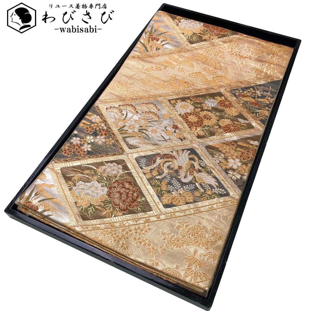 金色ベースの煌びやかなお色、菱形に四季の花模様,、松、鳥などの柄行がデザインされた素敵なお品でございます。