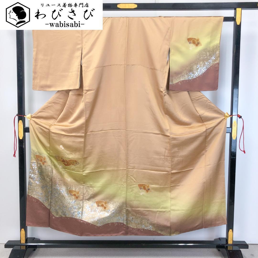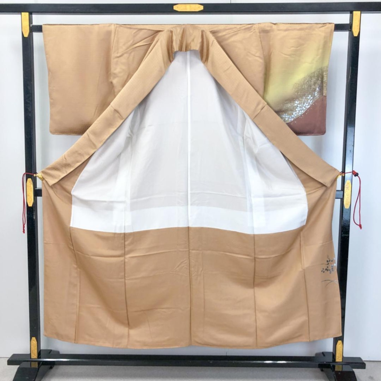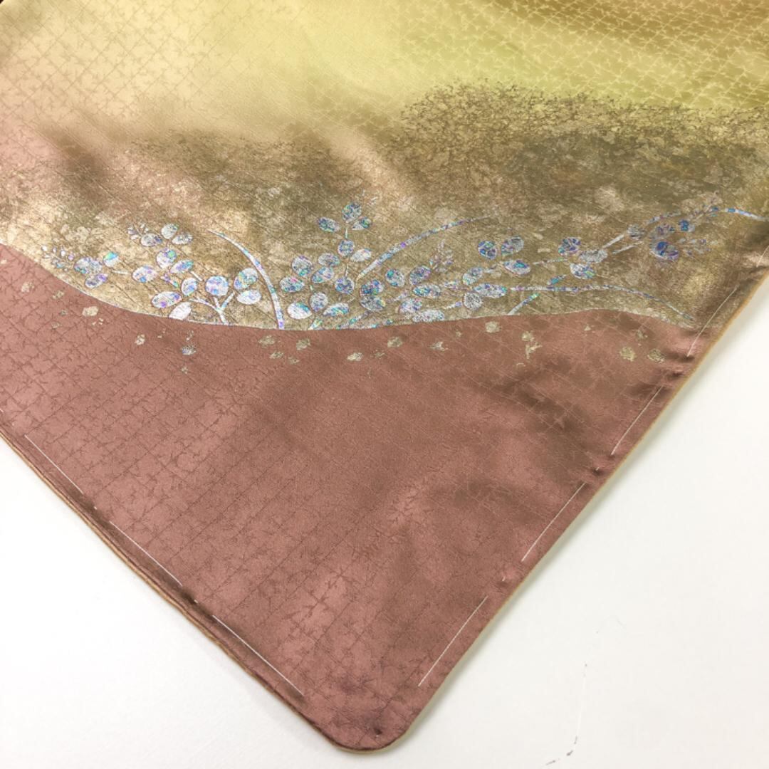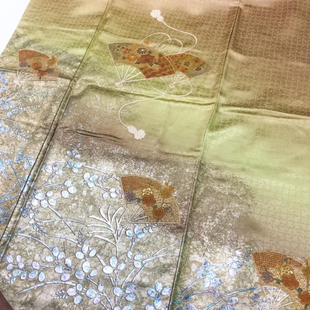 丁子茶色ベースのお色味に暈し、扇に花模様の刺繍、金銀彩の柄行がデザインされた素敵なお品でございます。