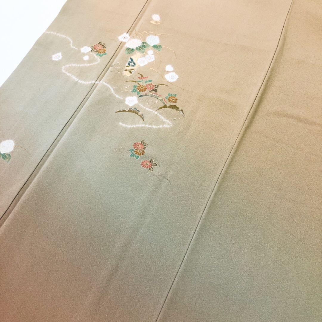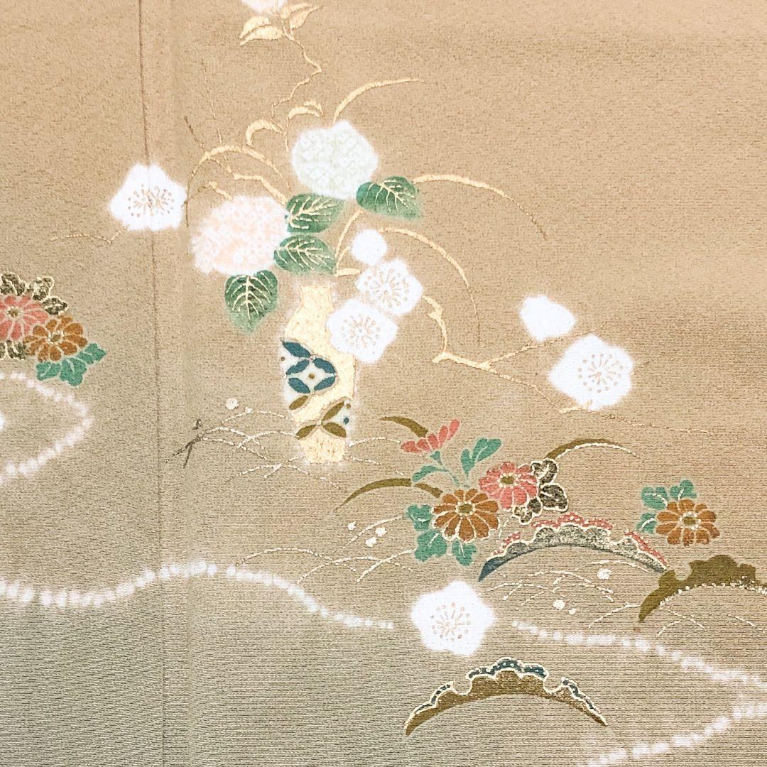 付下げ 作家物 雪芝に絞り柄花模様 藁色 縮緬 金彩 K-4572 着物 きもの kimono 和服 和装 中古 リサイクル着物 【送料無料】
