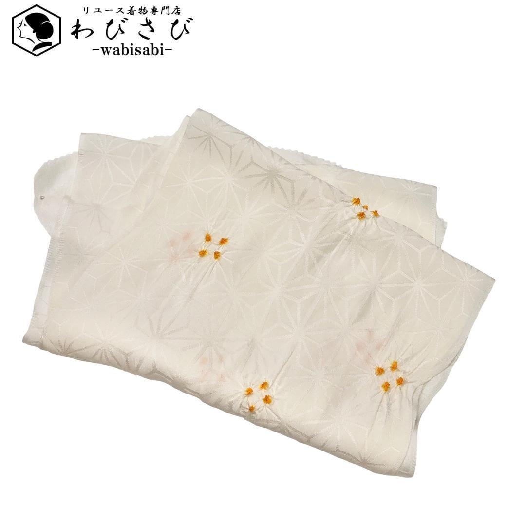 乳白色のお色味に麻の葉の地模様に絞りの柄裄がデザインされた素敵なお品でございます。
