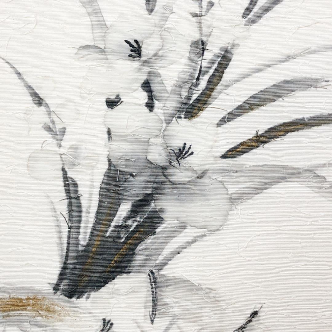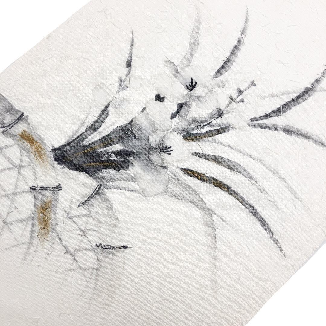 名古屋帯 作家物 髭紬 手描き 花模様 金彩 乳白色 しつけ糸 O-4940 着物 きもの kimono 和服 和装 中古 リサイクル着物 【送料無料】