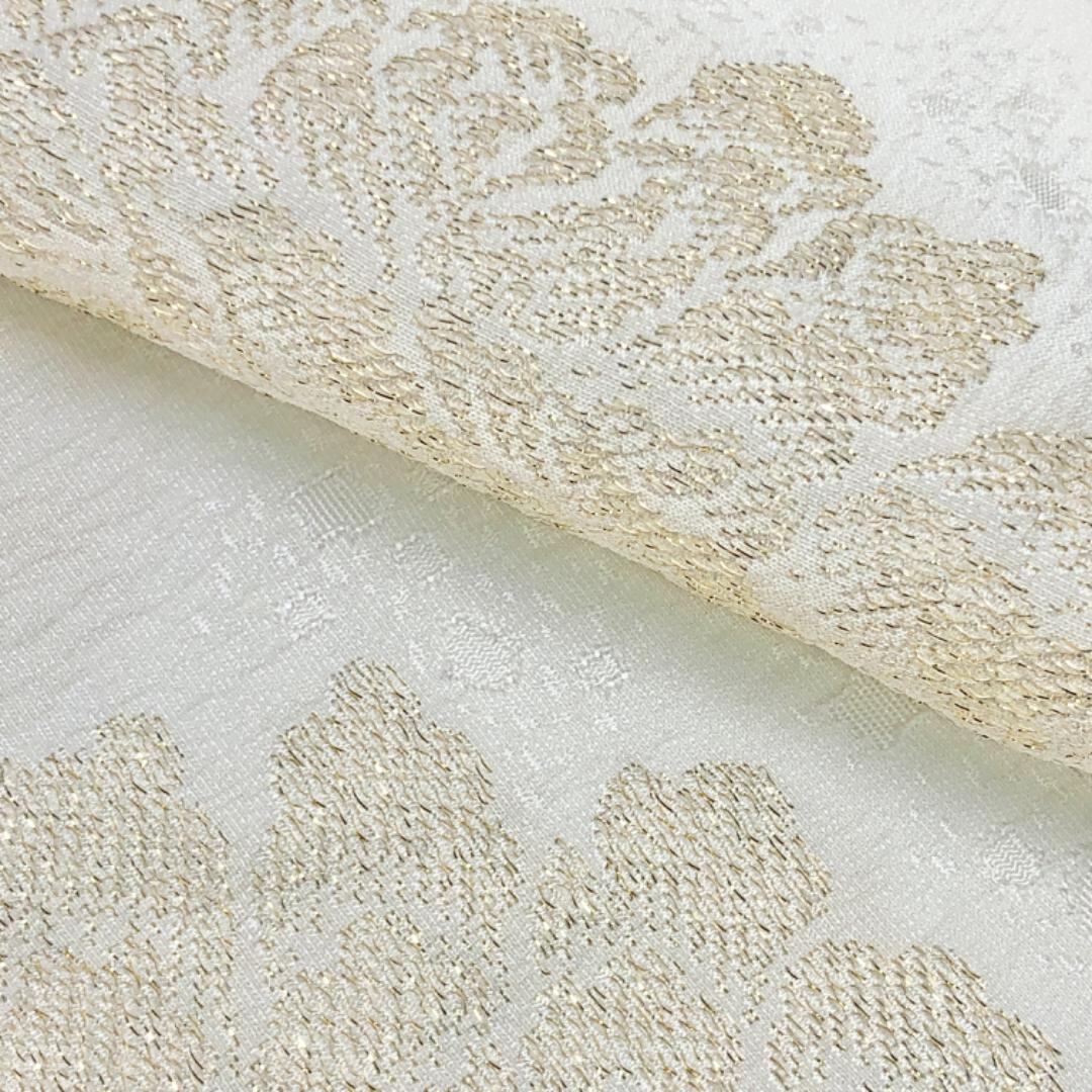 乳白色のお色味に金糸で花模様の柄裄がデザインされた素敵なお品でございます。