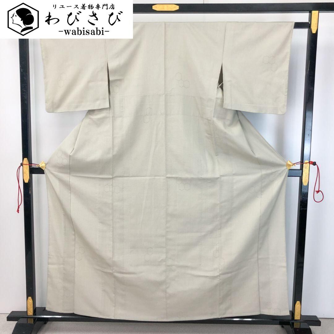 単衣 塩沢紬 六角模様 利休白茶色 K-4576 着物 きもの kimono 和服 和装 中古 リサイクル着物 【送料無料】