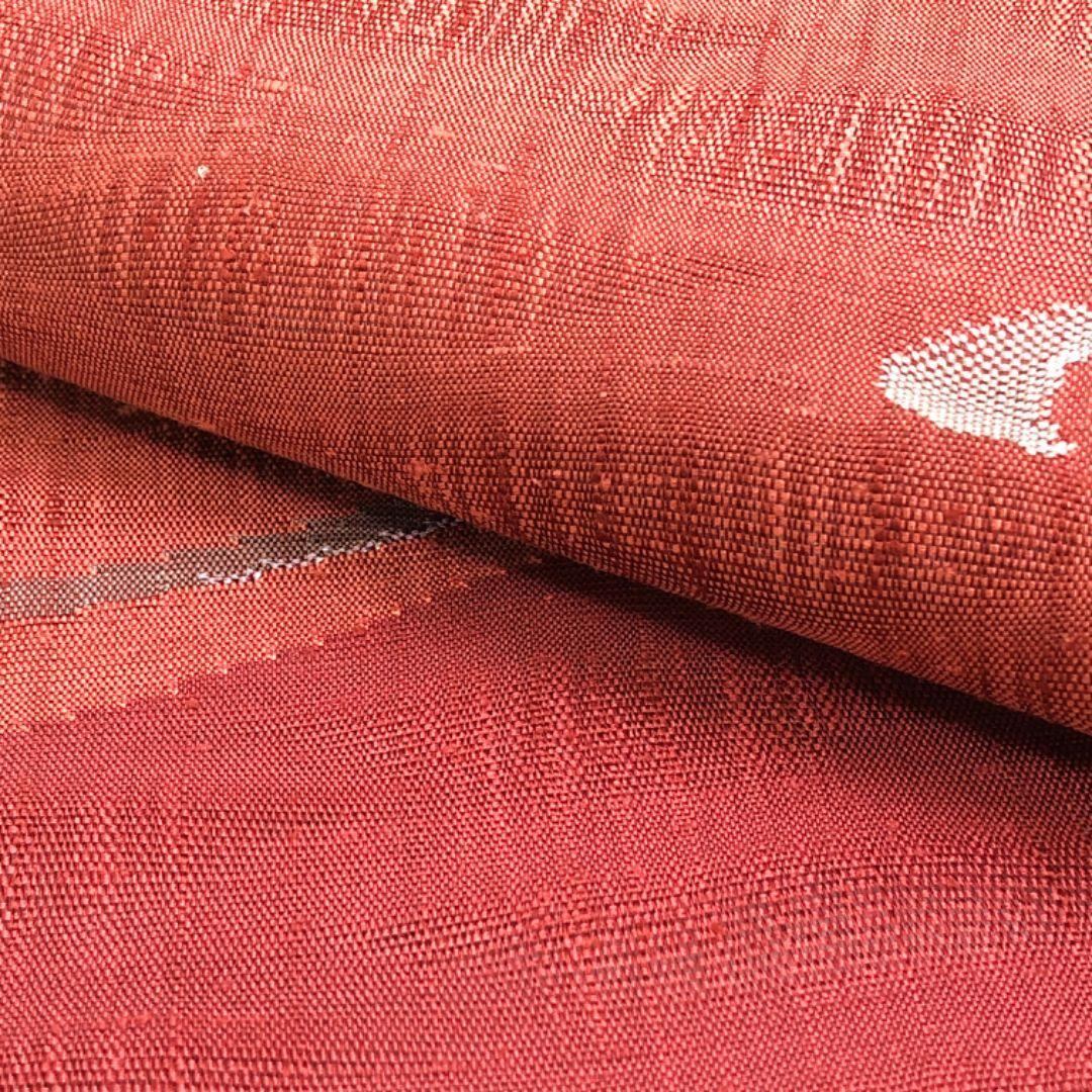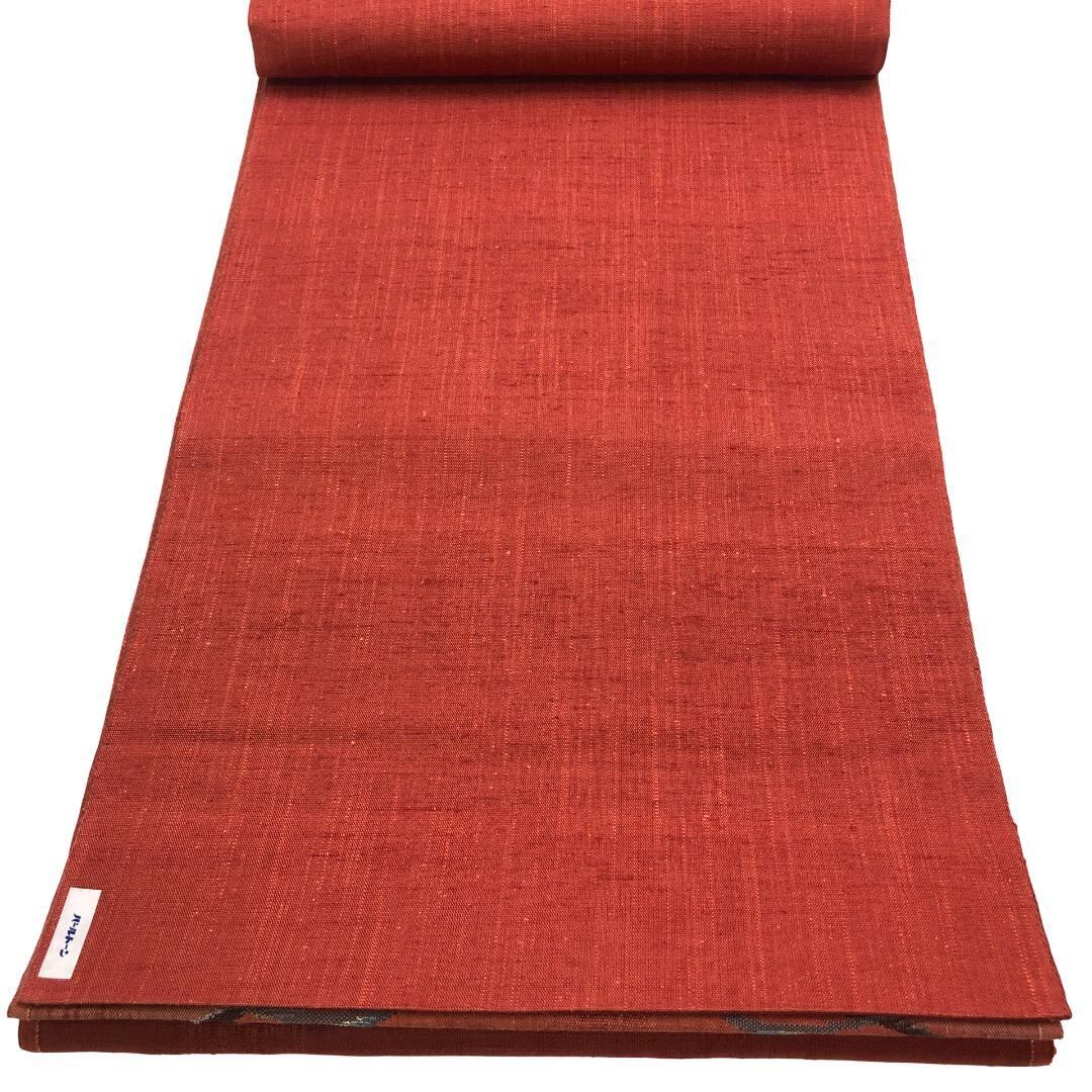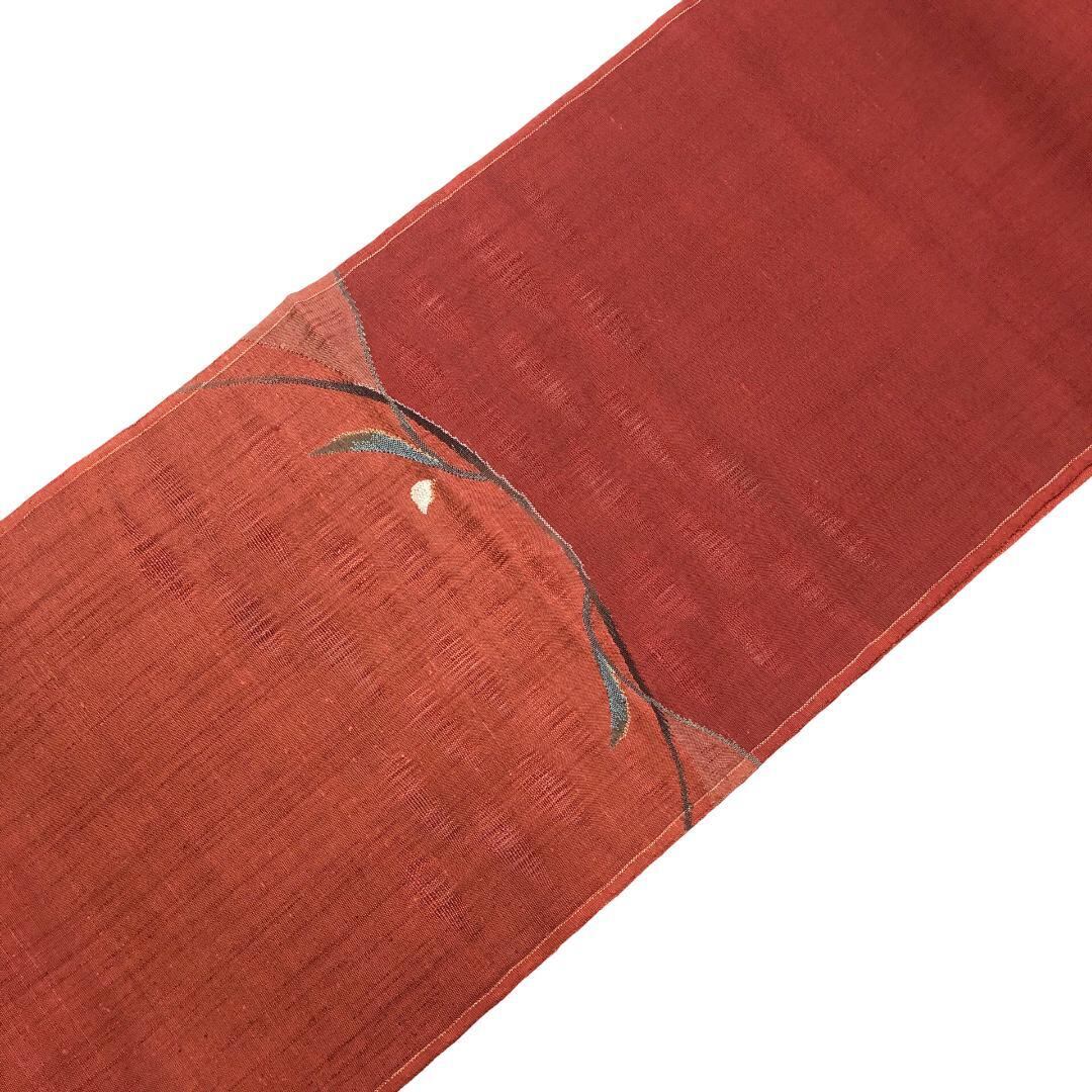 緋銅色ベースのお色味の紬地に上品な花模様がデザインされたすくい織の雰囲気の良い素敵なお品でございます。