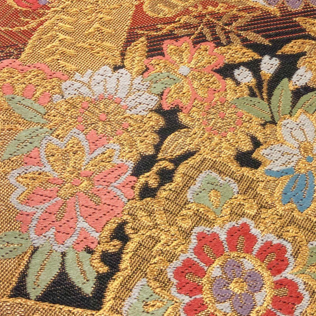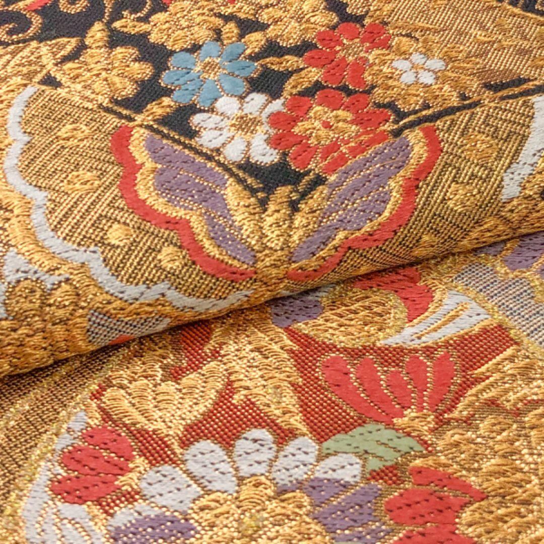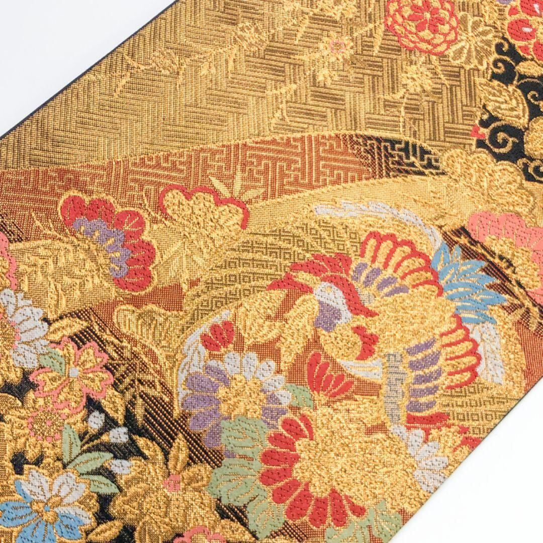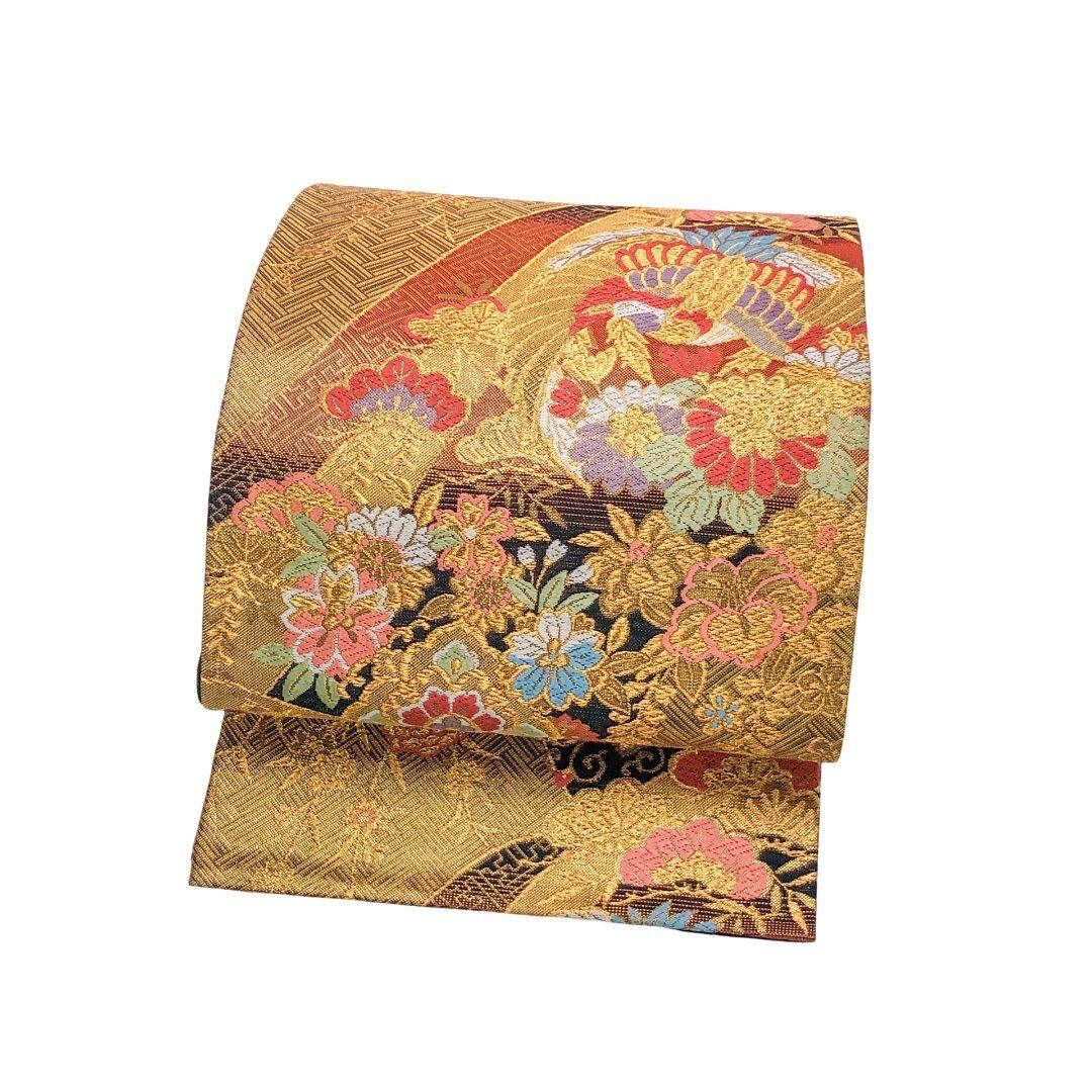 金色ベースのお色味に煌びやかな花柄模様、松、鳥、蝶々などの柄行がデザインされた素敵なお品でございます。