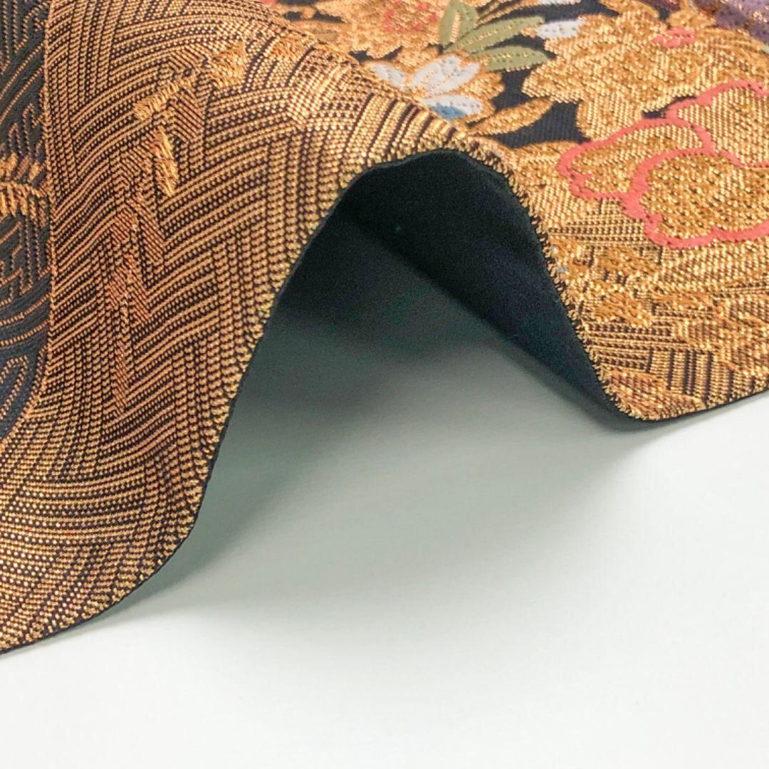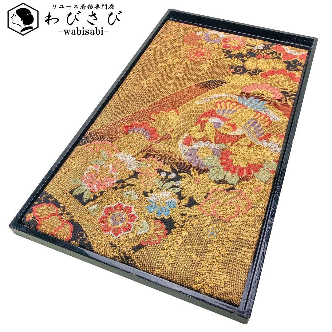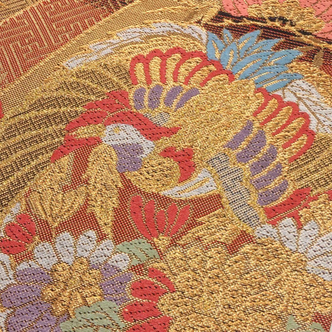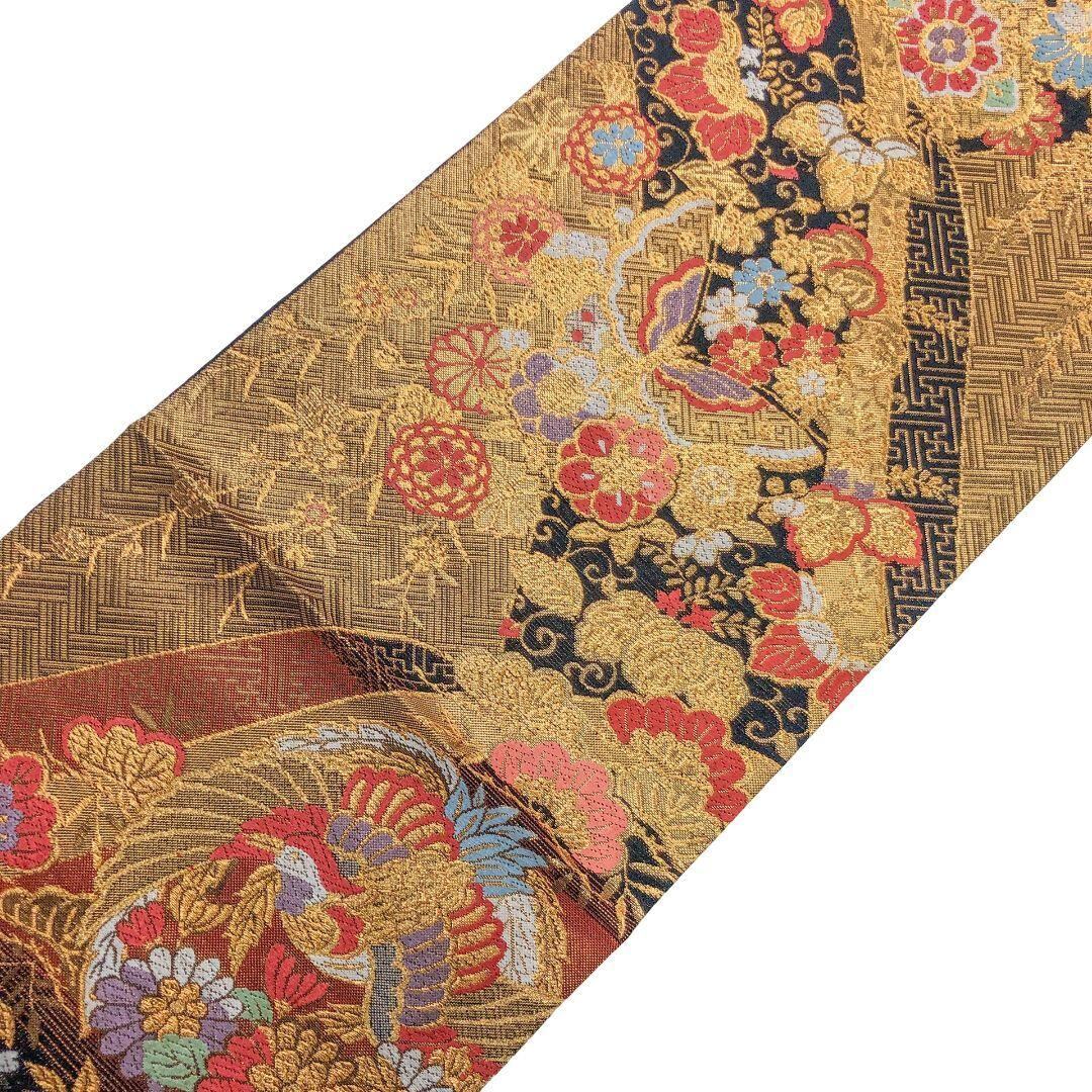金色ベースのお色味に煌びやかな花柄模様、松、鳥、蝶々などの柄行がデザインされた素敵なお品でございます。