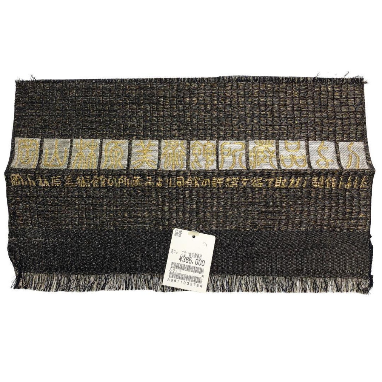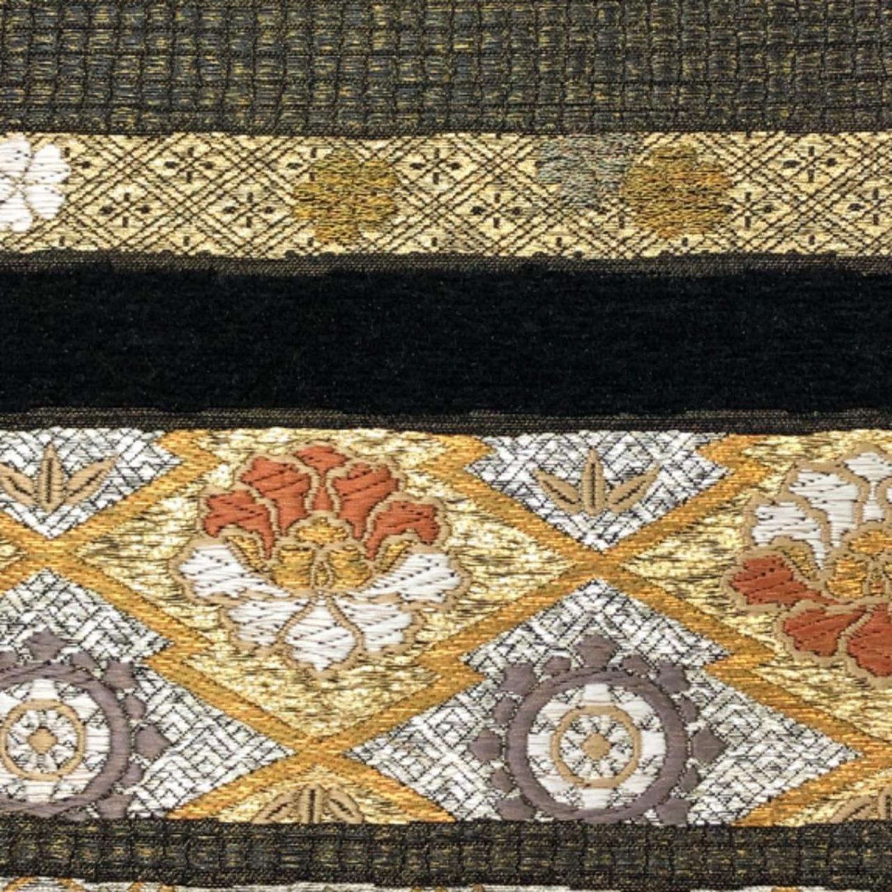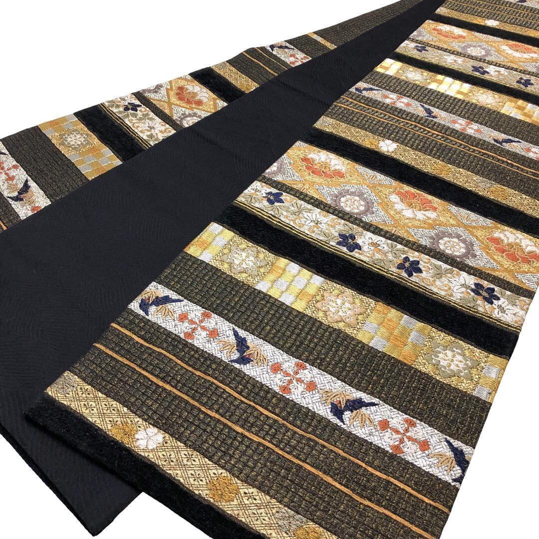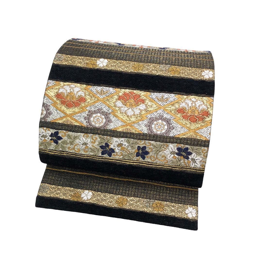 岡山林原美術館所蔵品、黒色ベースのお色味に唐織の美しい横段織模様がデザインされた高級感のある素敵なお品でございます。