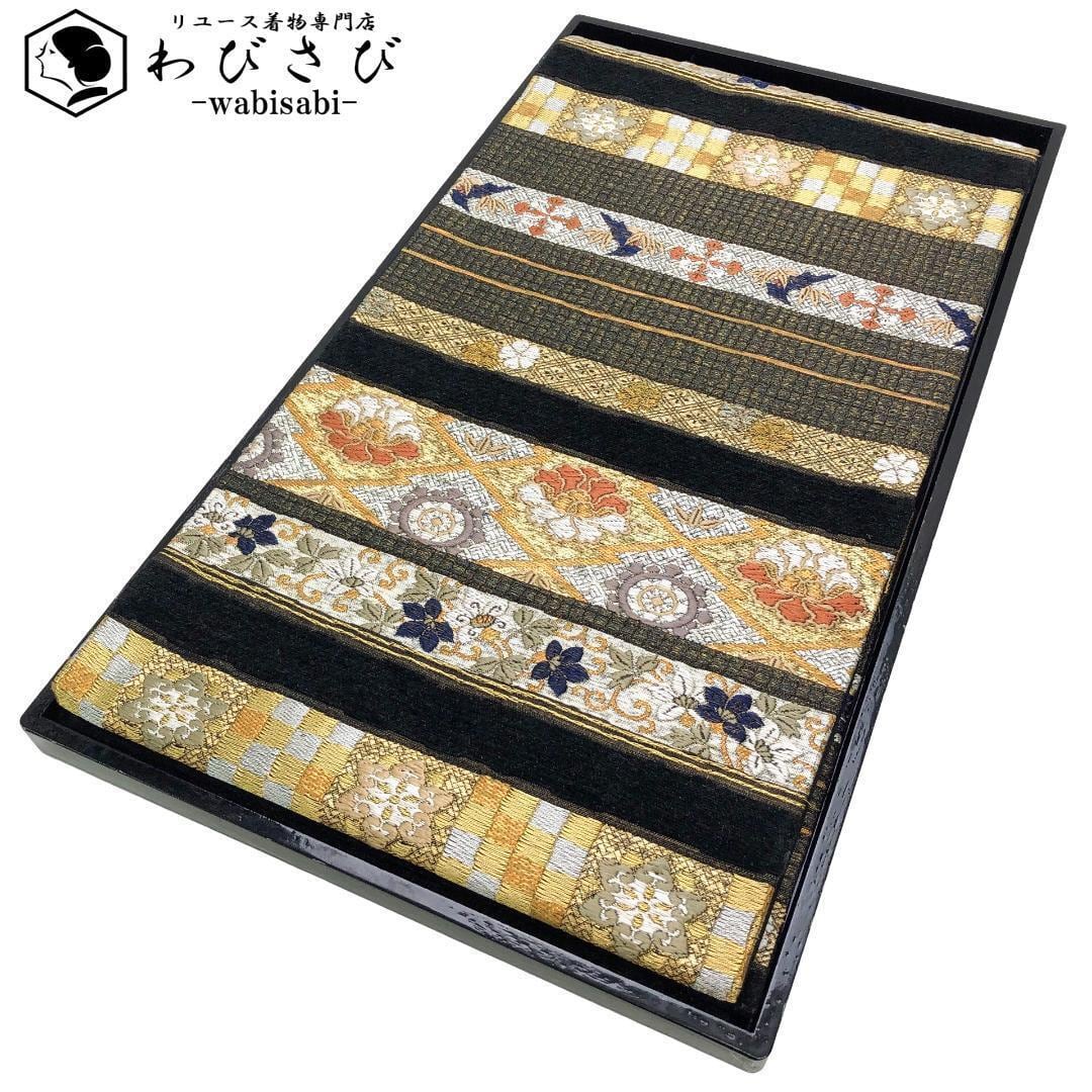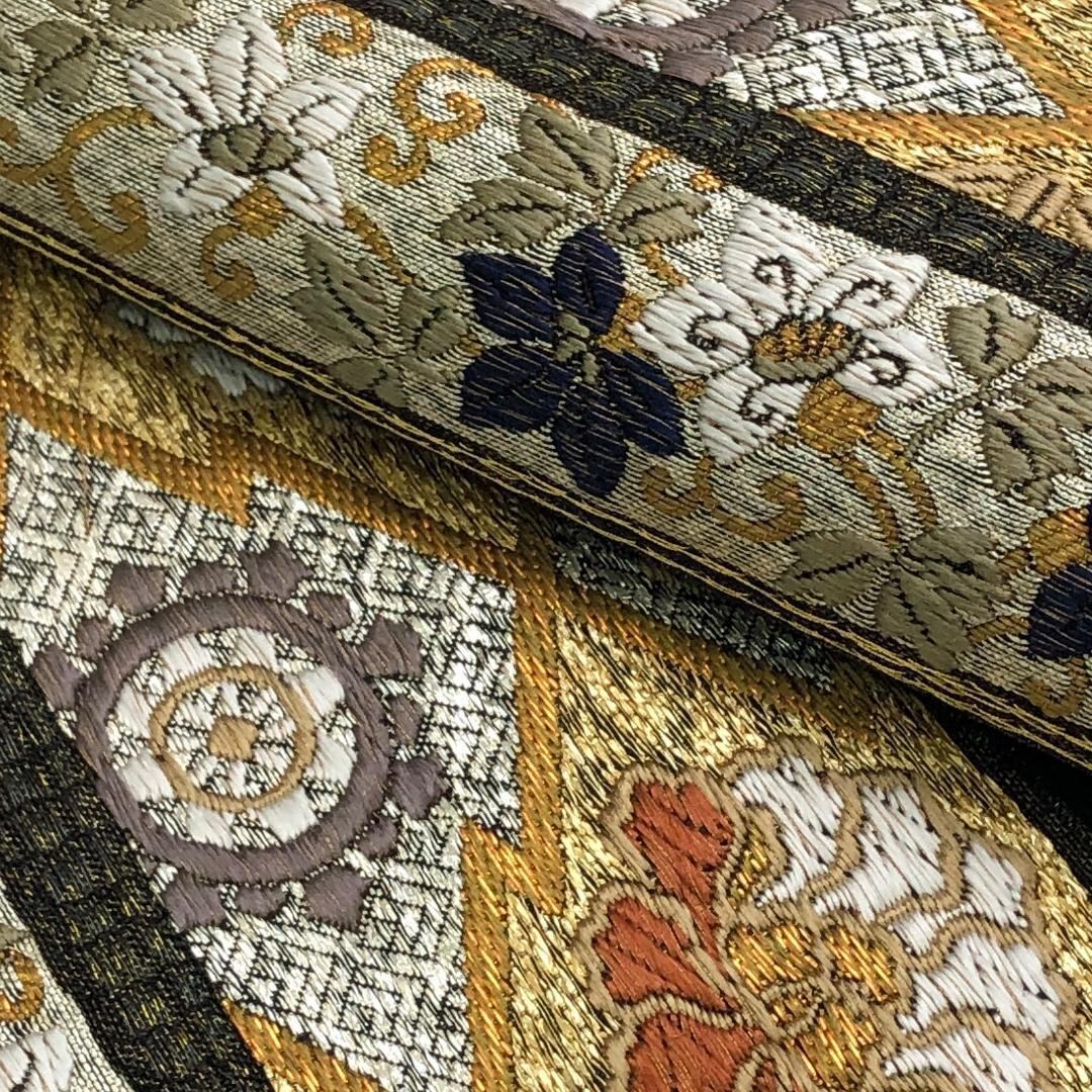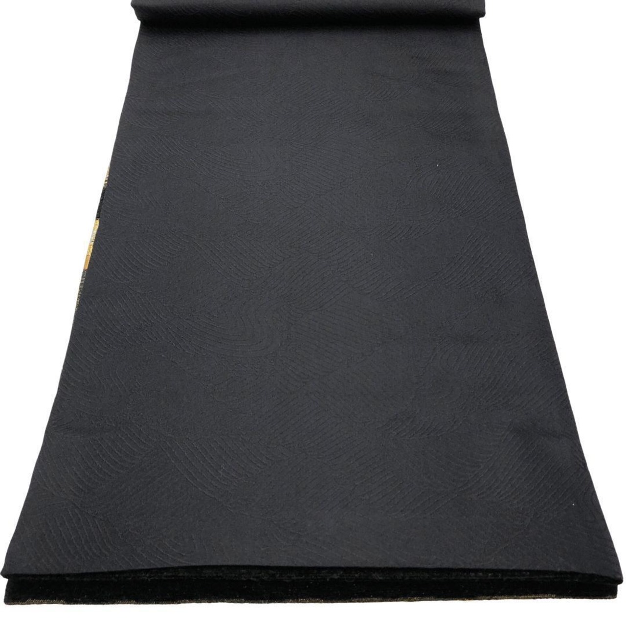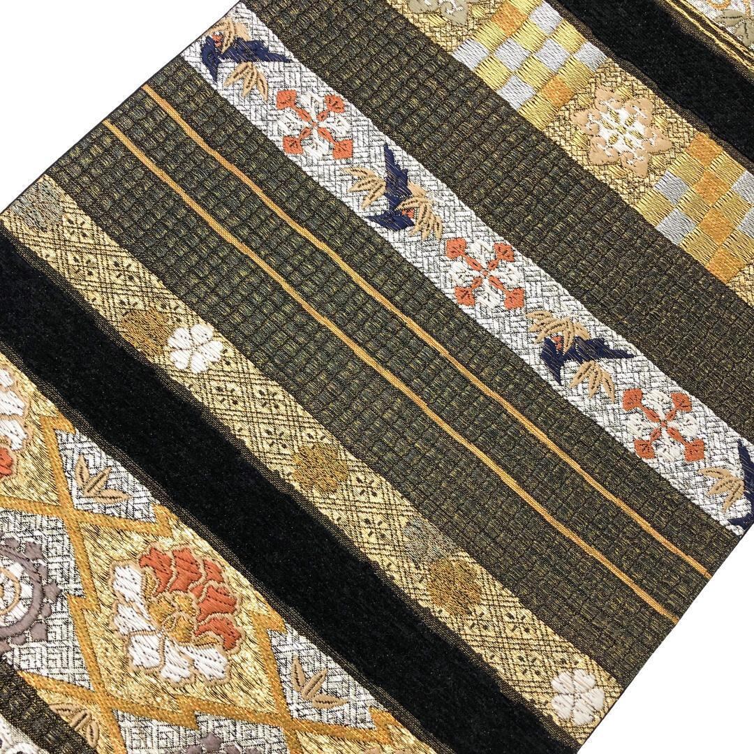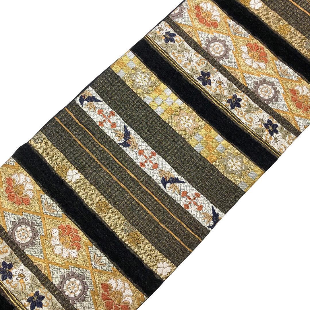 岡山林原美術館所蔵品、黒色ベースのお色味に唐織の美しい横段織模様がデザインされた高級感のある素敵なお品でございます。