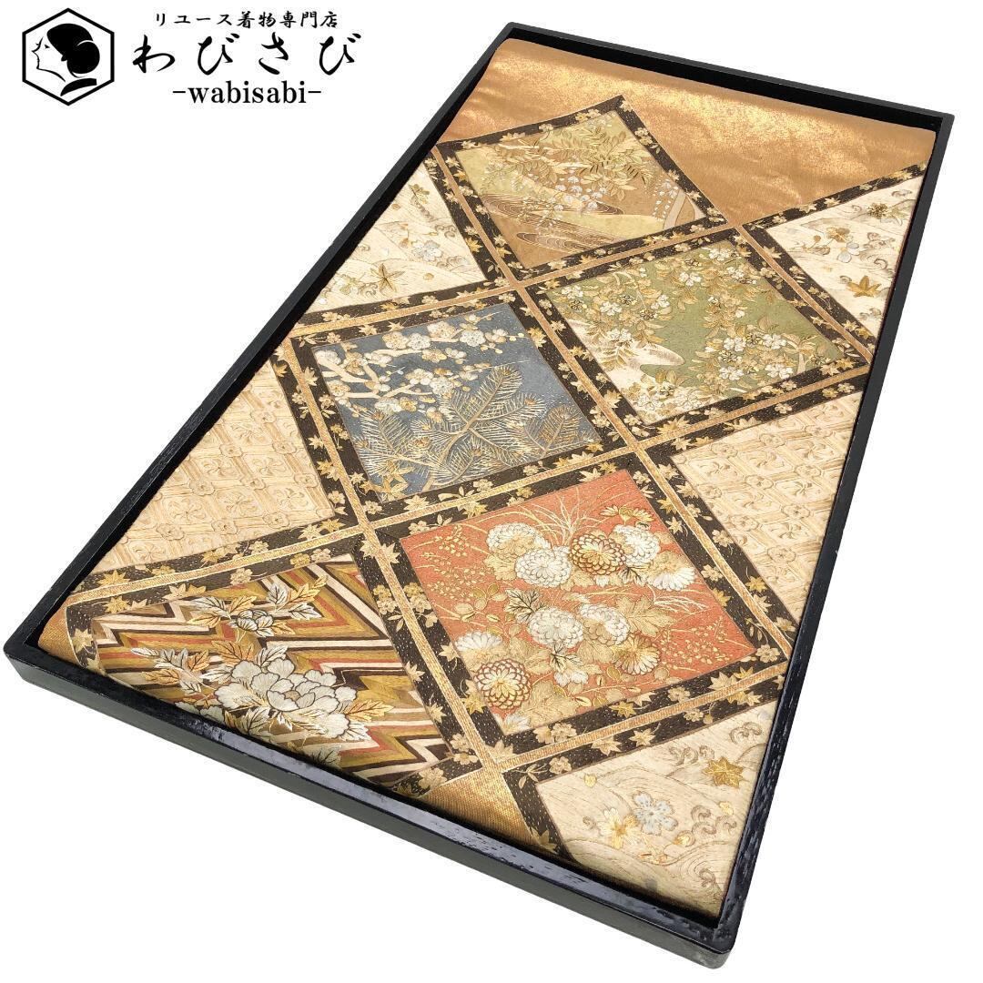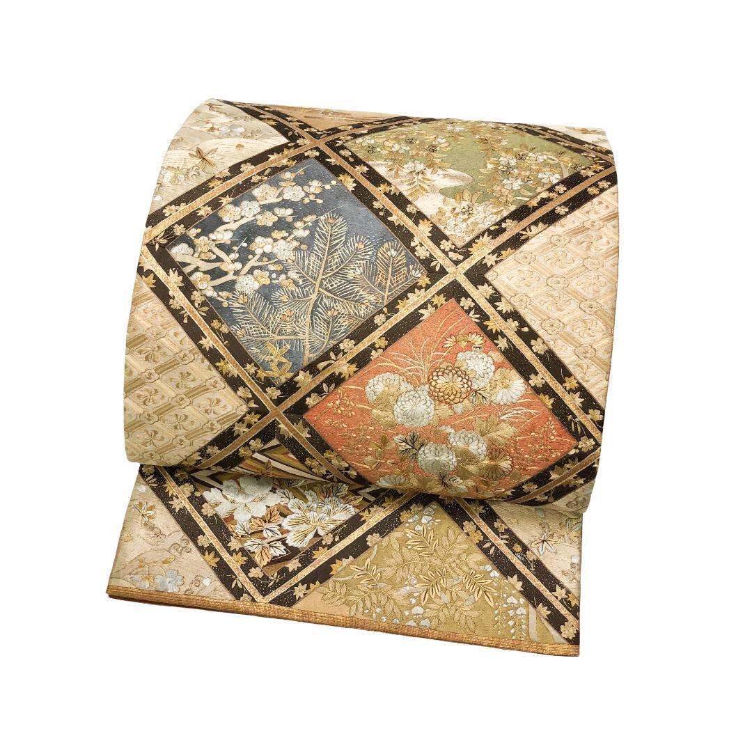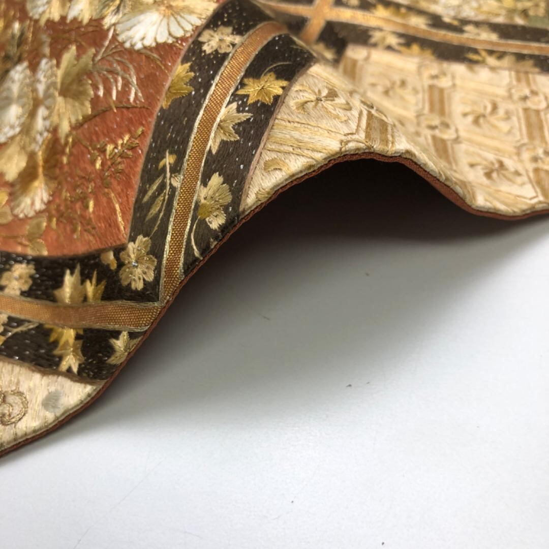 金茶色ベースのお色味に菱模様に全て刺繍の美しい花柄模様がデザインされた素敵な柄裄のお品でございます。