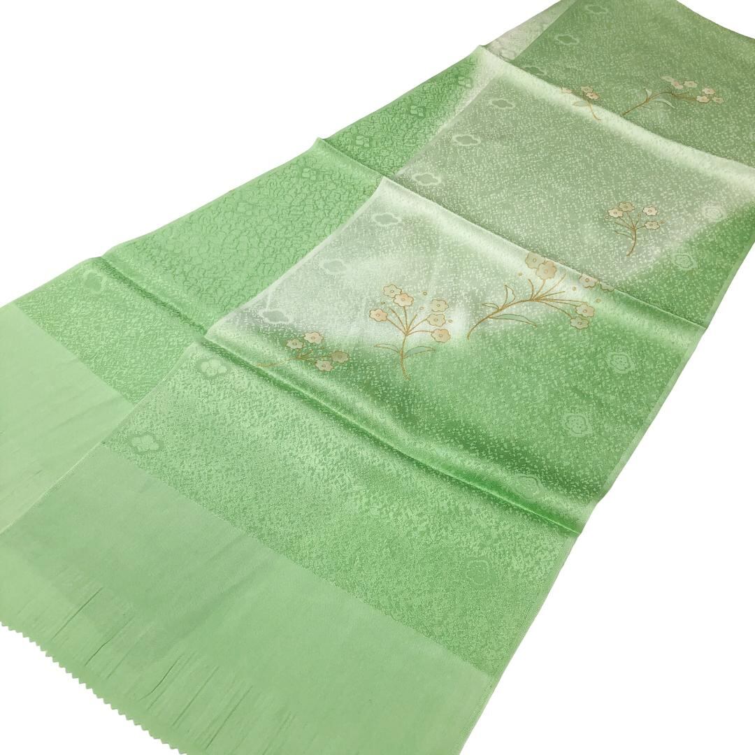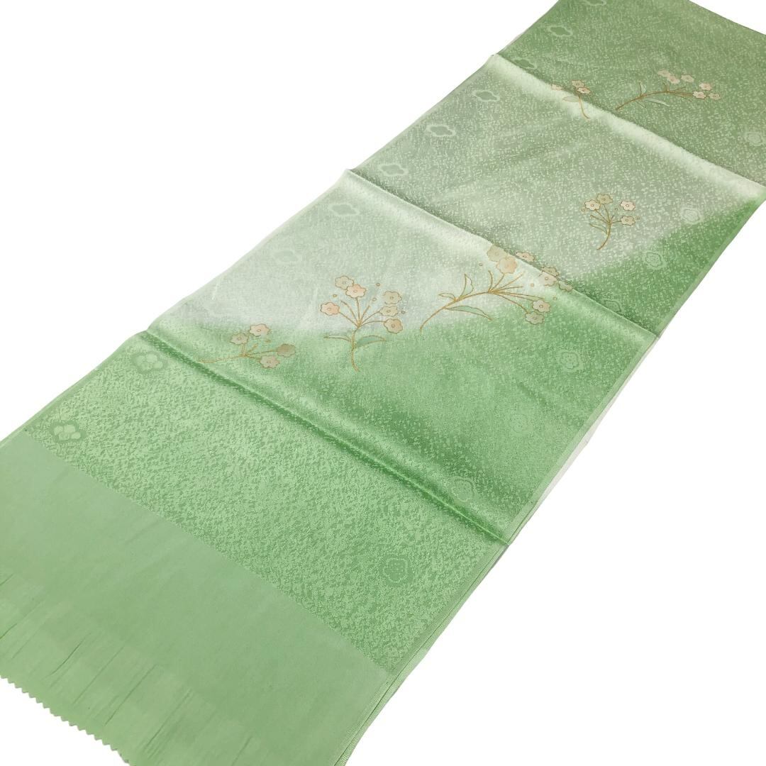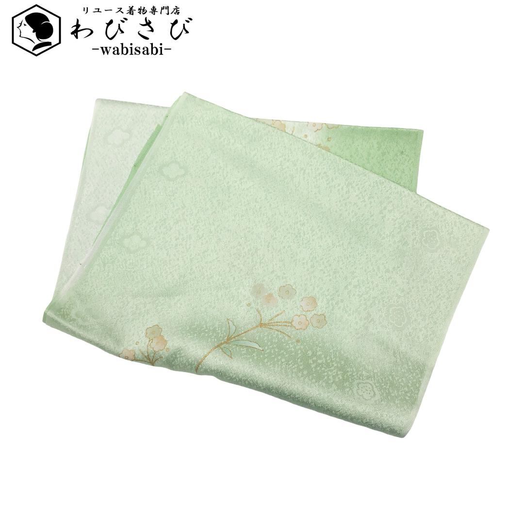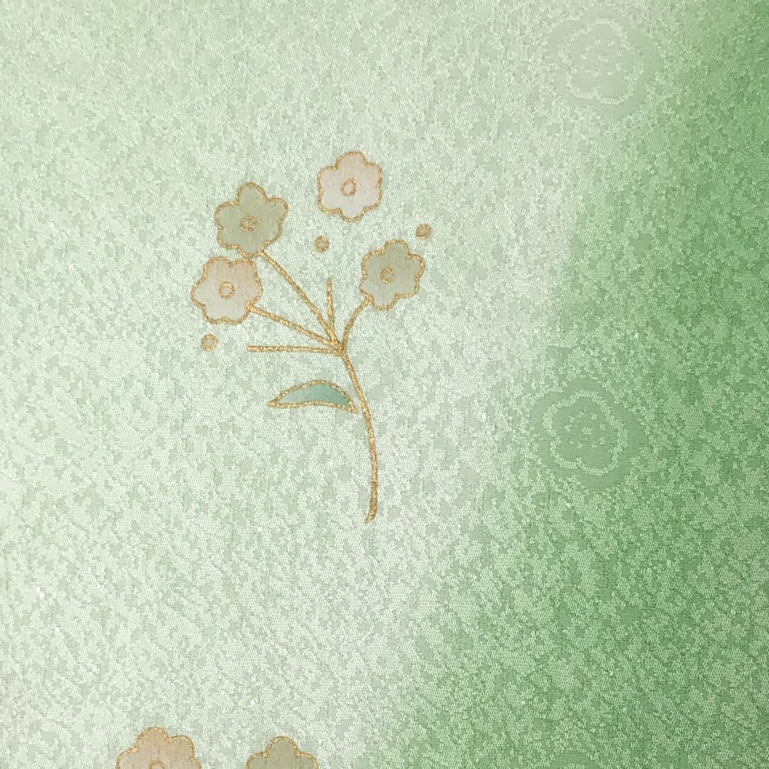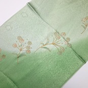 薄黄緑色のお色味に暈し、花模様の柄裄がデザインされた素敵なお品でございます。