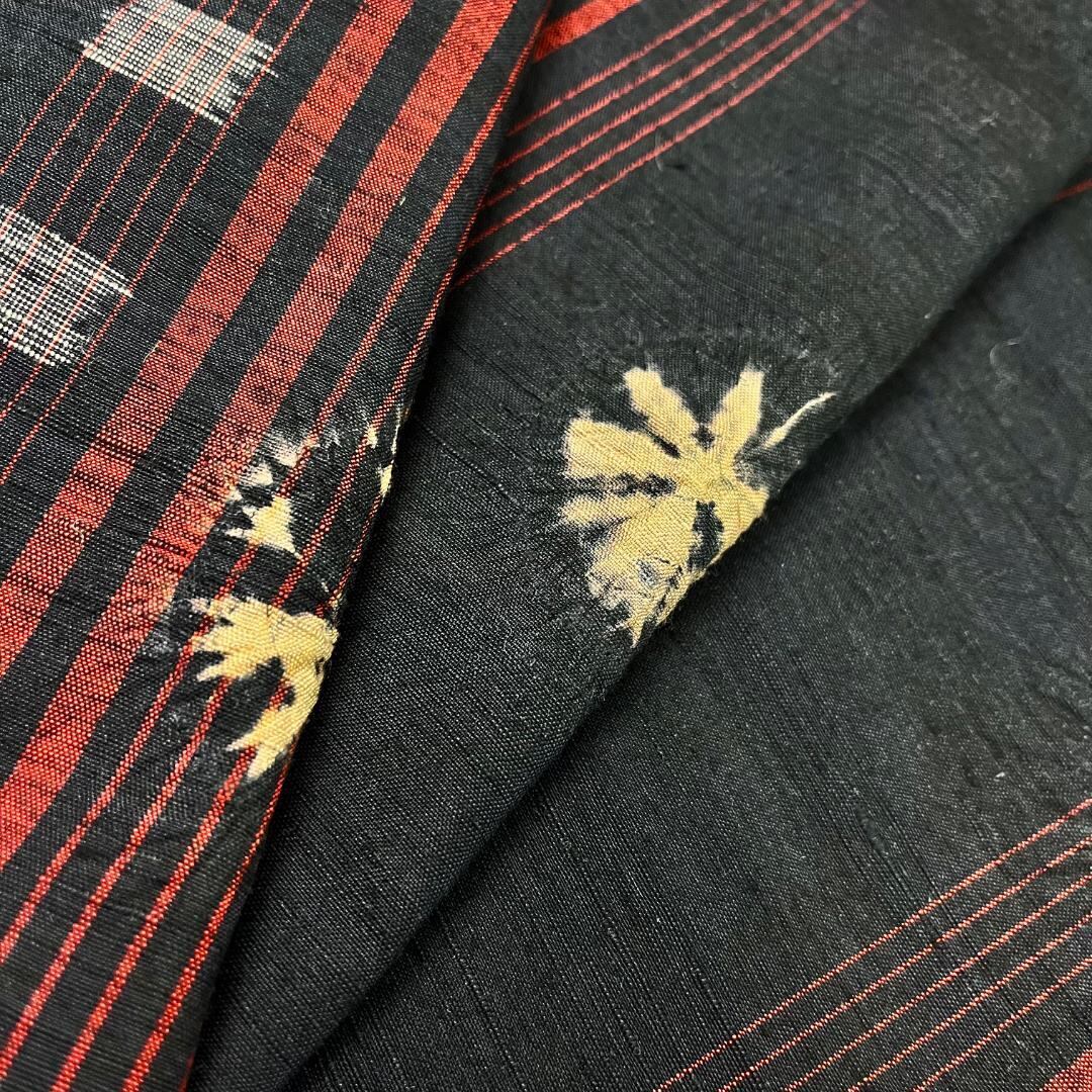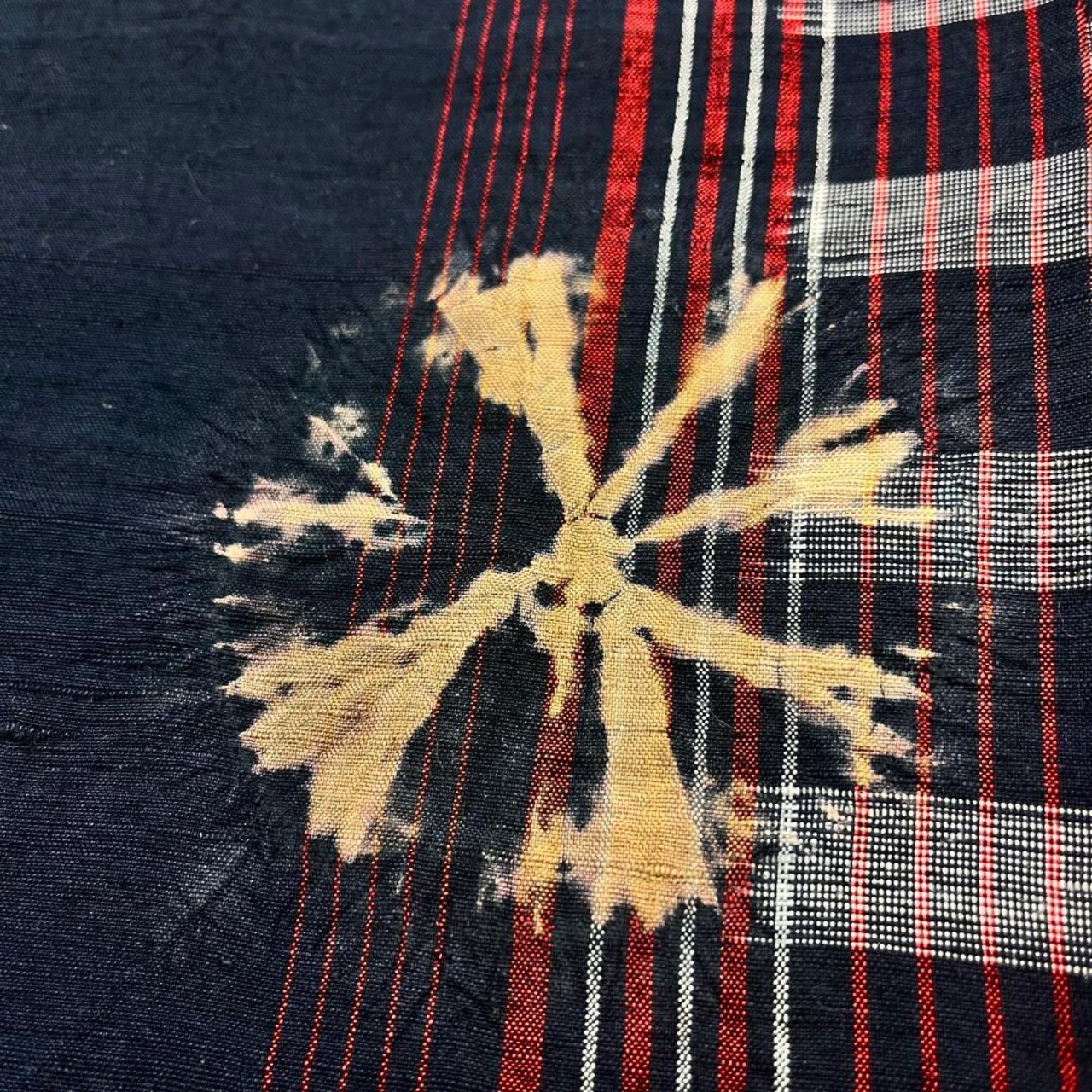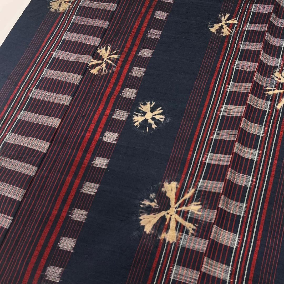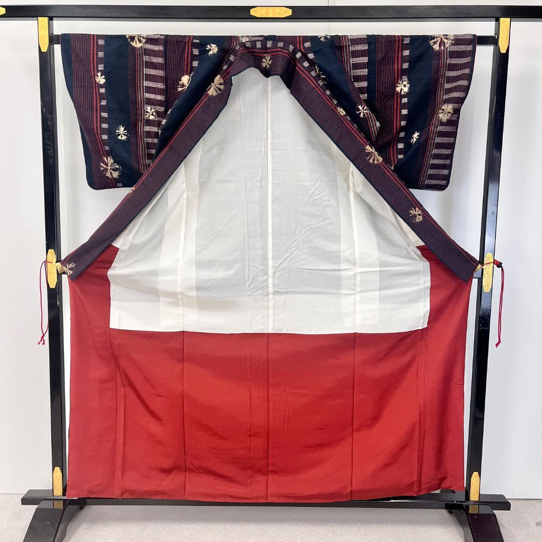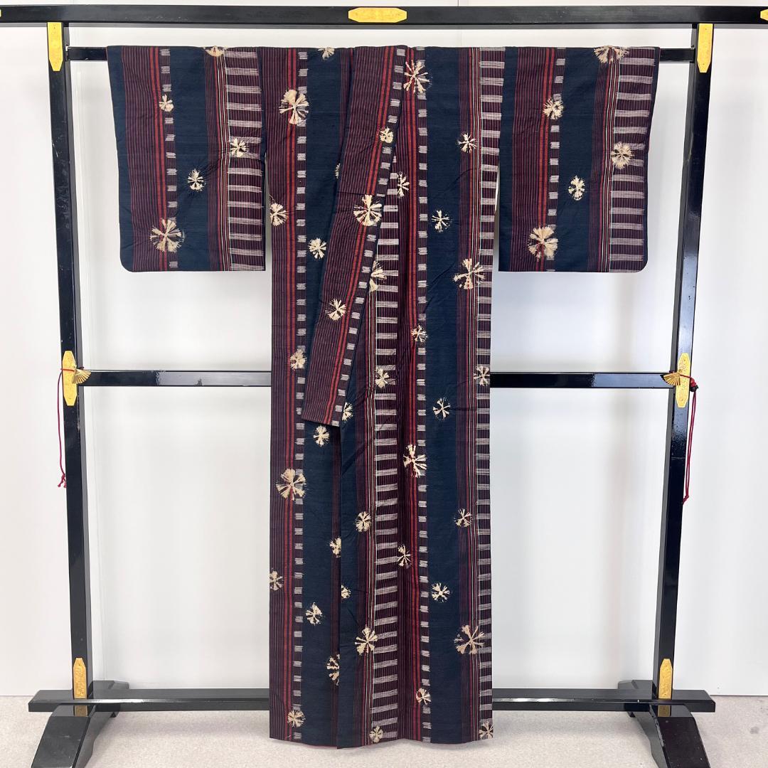 濃紺色ベースのお色味に雰囲気の良い絞り柄、縦縞模様がデザインされた素敵なお品でございます。