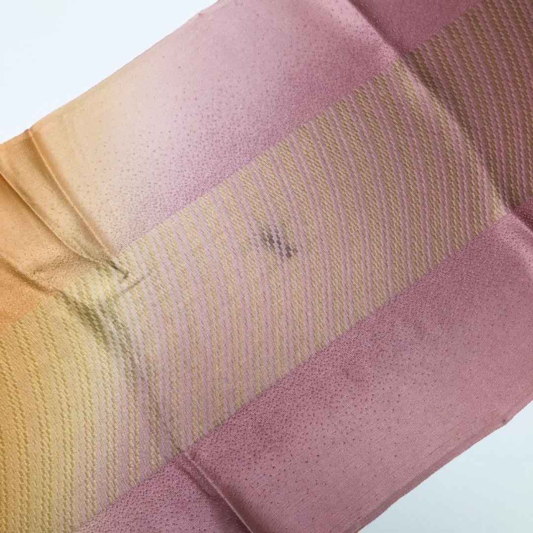 一斤染色、玉蜀黍色ベースの美しい暈しのお色味に金糸、斜め縞模様がデザインされた素敵なお品でございます。