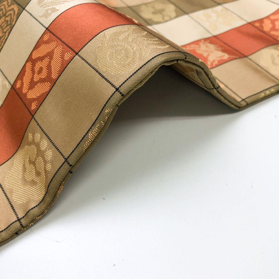 金糸が使われた格子柄に多彩なお色味、花柄模様、七宝などの柄裄がデザインされた素敵なお品でございます。
