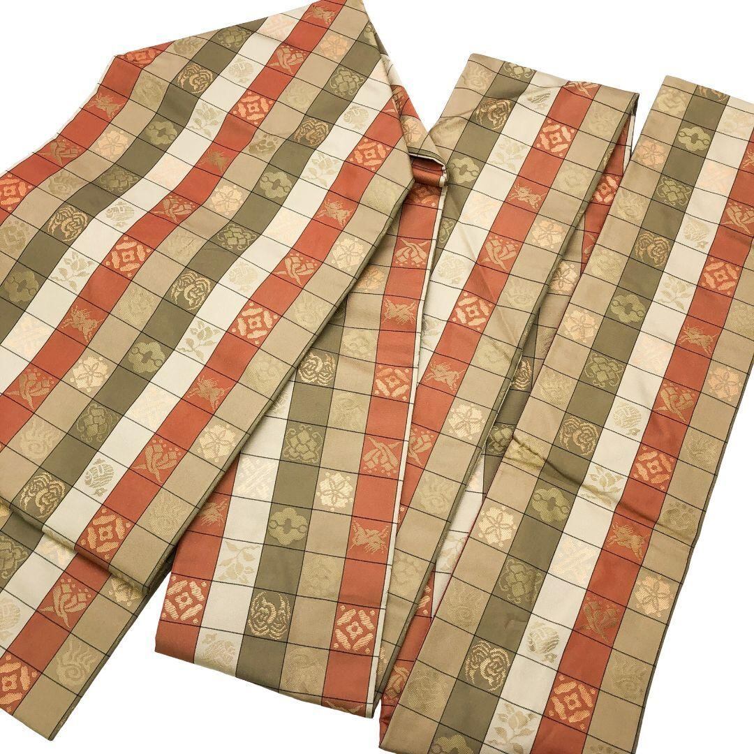 名古屋帯 総柄 格子柄 花柄模様 七宝 金色 O-4952 着物 きもの kimono 和服 和装 中古 リサイクル着物 【送料無料】