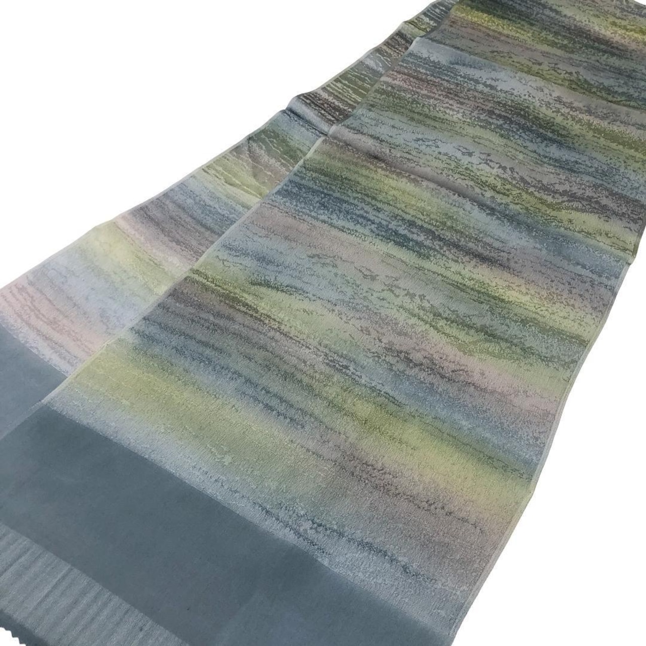 錆浅葱色ベースのお色味に美しい暈し模様がデザインされた上品な雰囲気の素敵な柄裄のお品でこざいます。