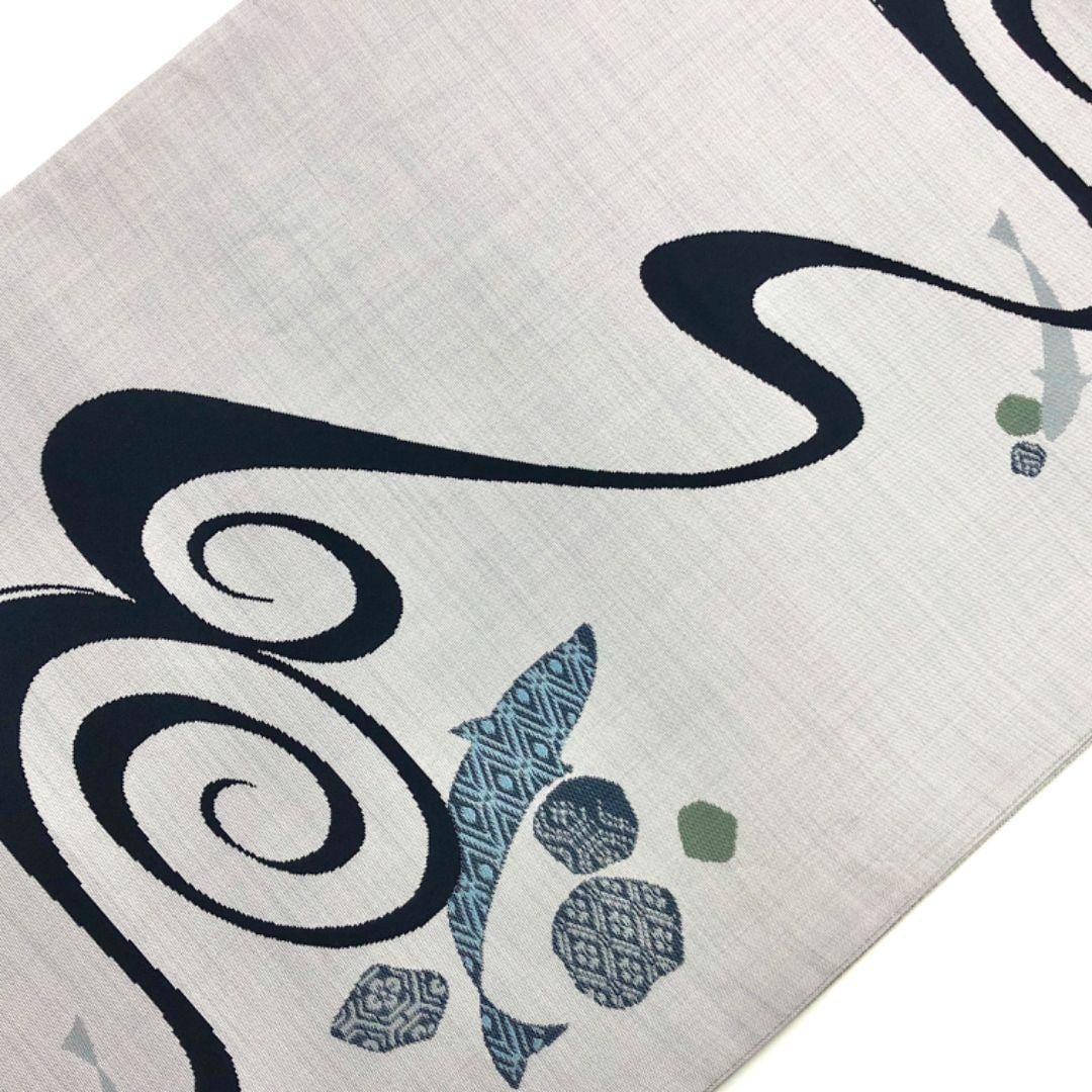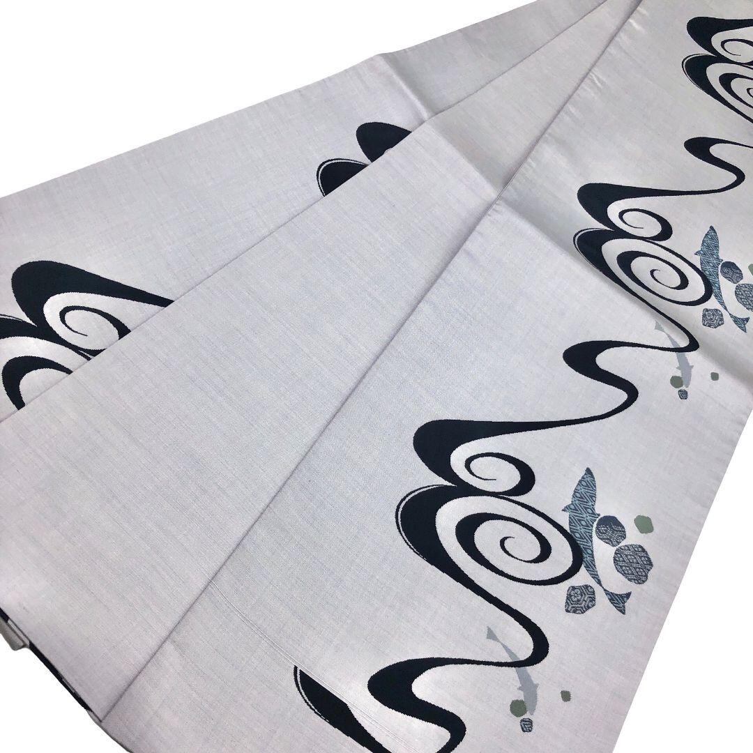 薄墨色の上品なお色味、流水に優雅に泳ぐ魚模様がデザインされた雰囲気の良い素敵な柄行のお品でございます。