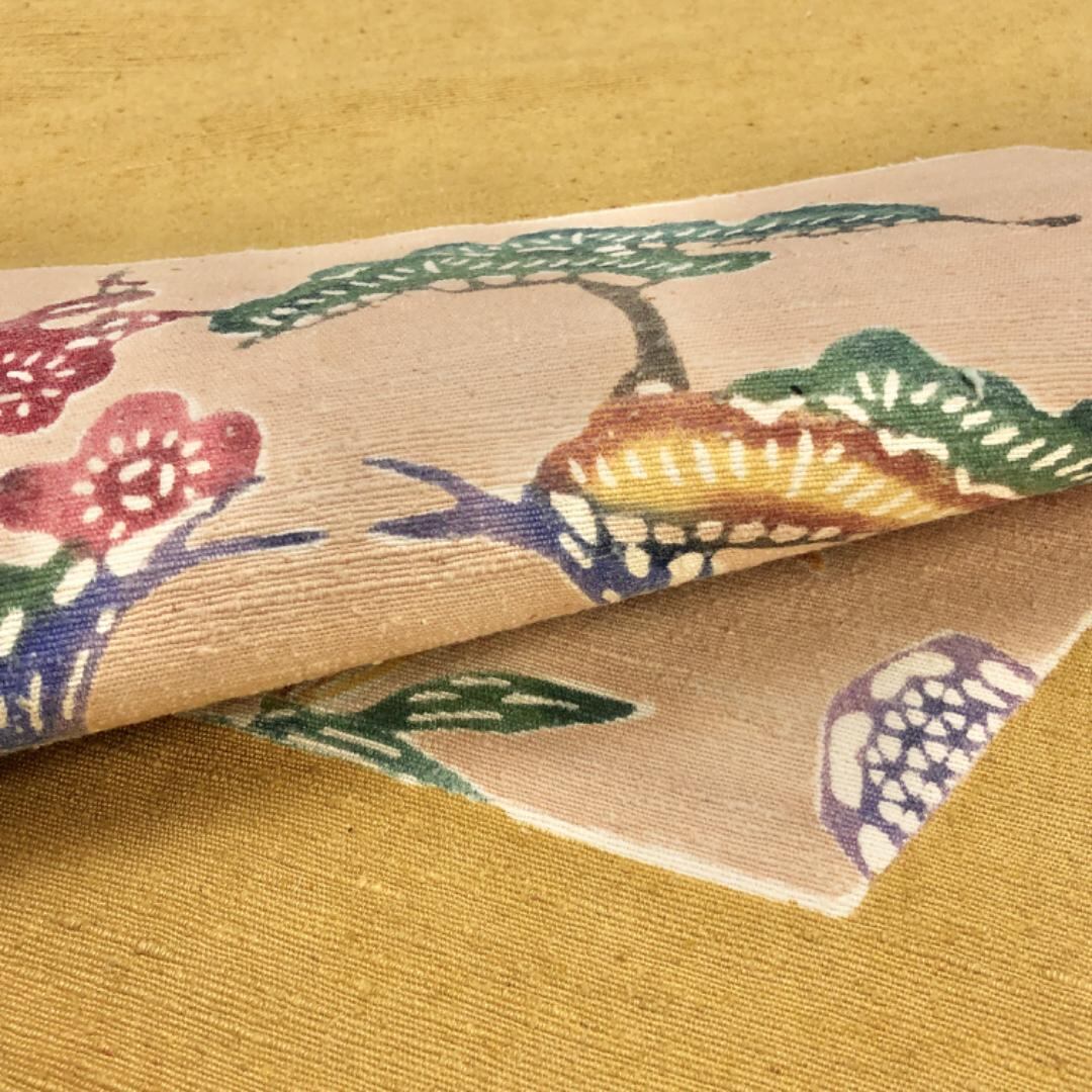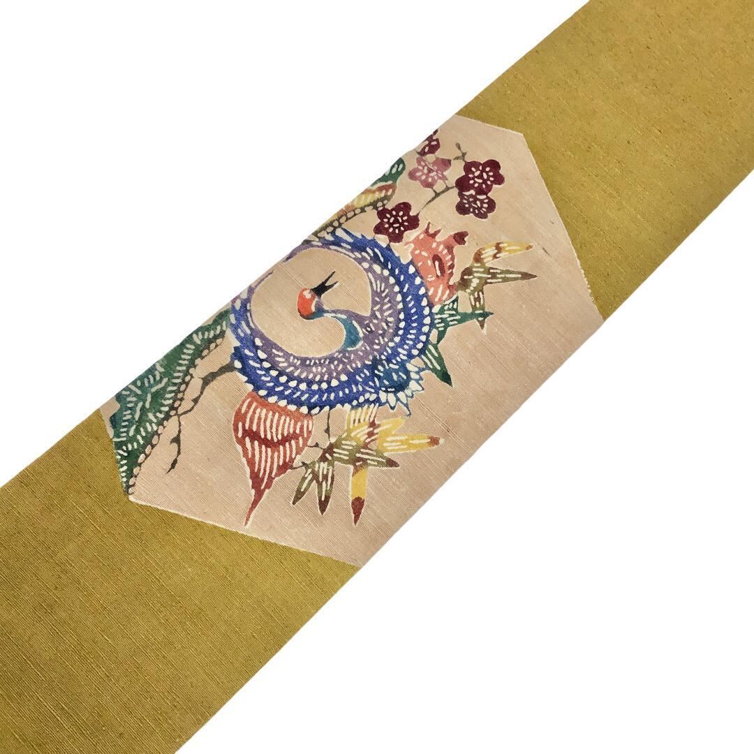 名古屋帯 紬 紅型 型染 松竹梅に鶴 黄土色 O-4966 着物 きもの kimono 和服 和装 中古 リサイクル着物 【送料無料】