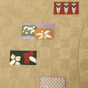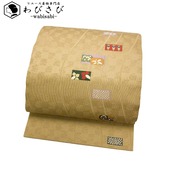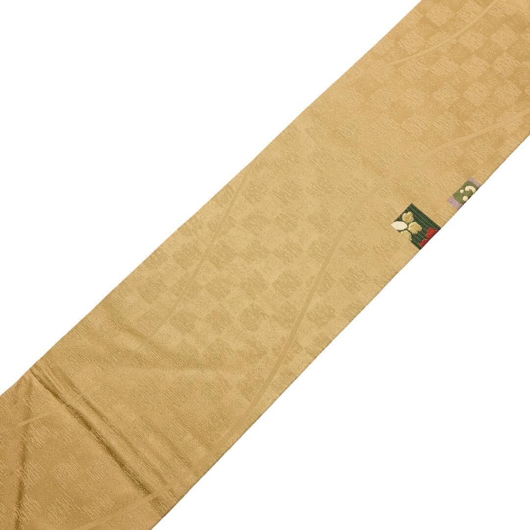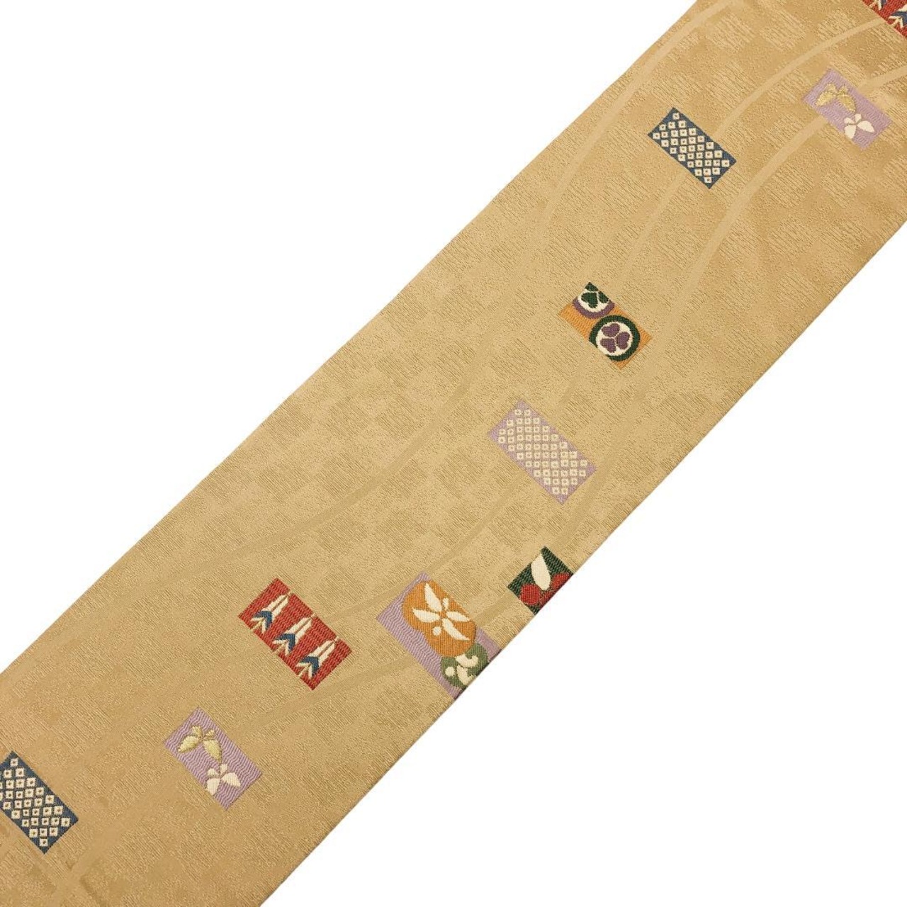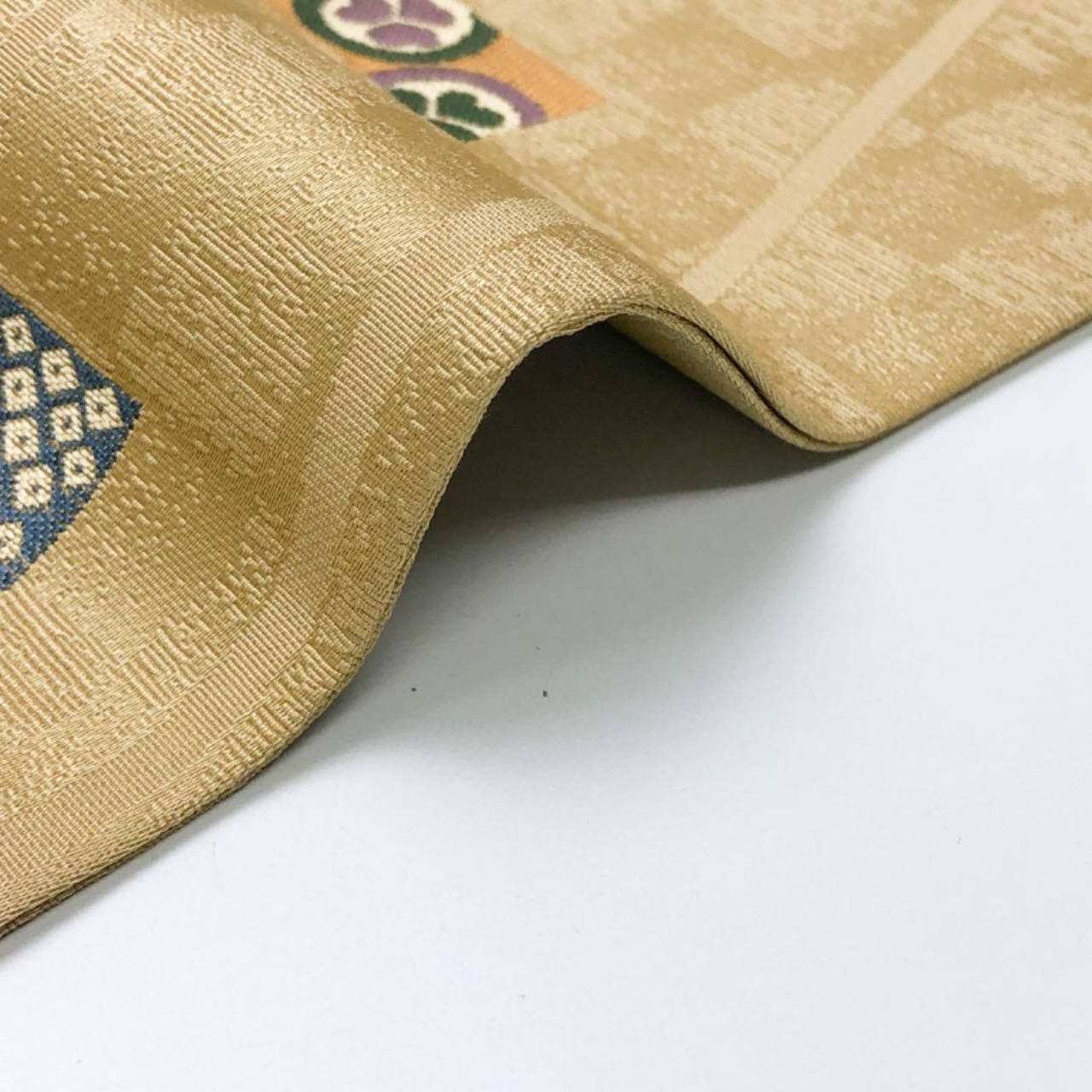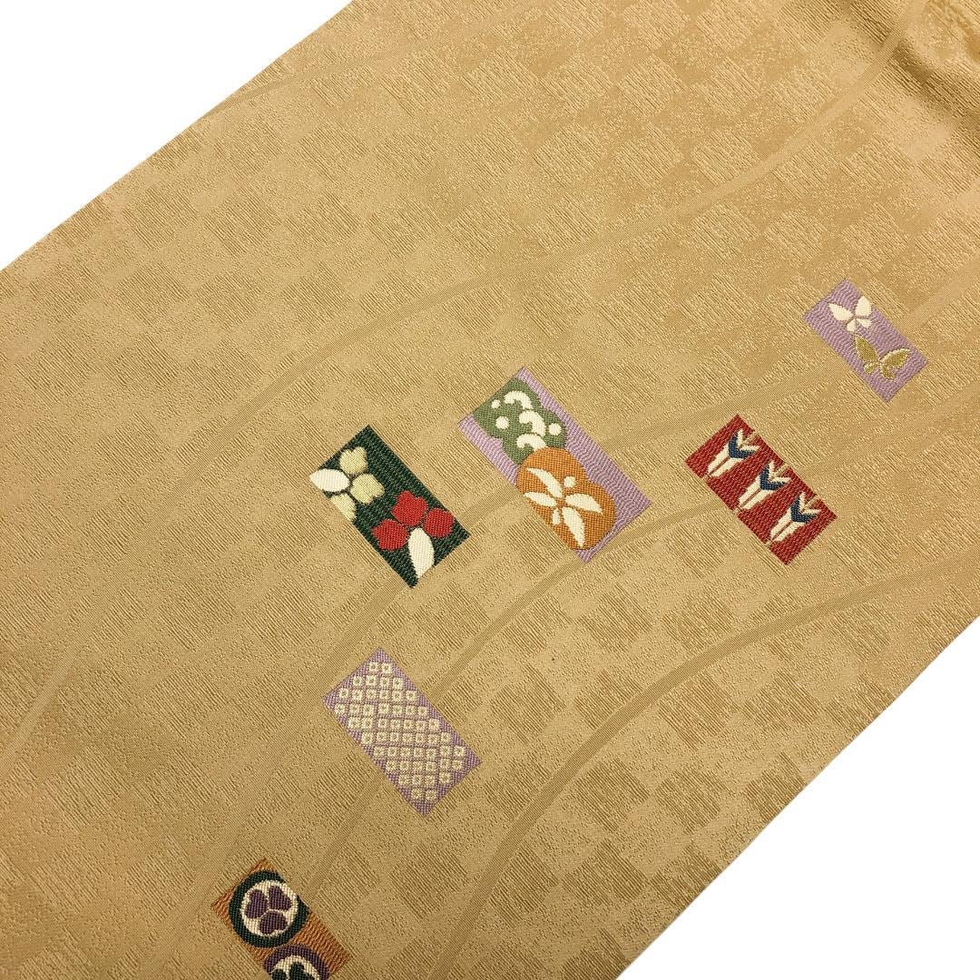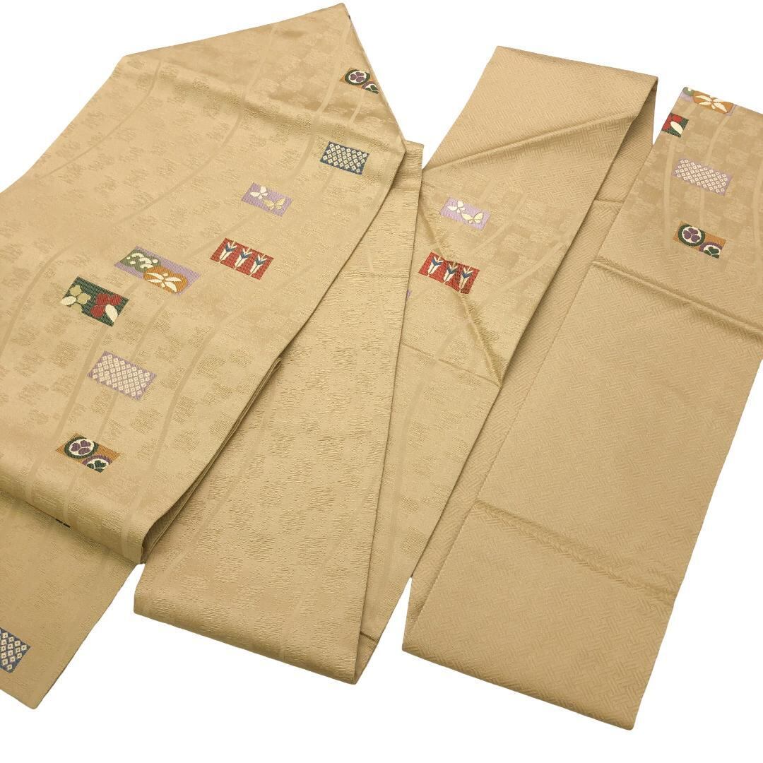 楊梅色のお色味に縦よれ縞模様、四角に蝶々、鹿の子などの多様な柄裄がデザインされた素敵なお品でございます。