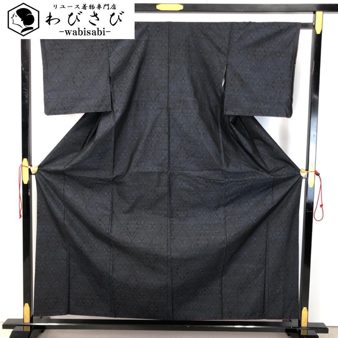 青褐色の落ち着いた藍泥染めの雰囲気の良いお色味、菱形に花柄模様がデザインされた素敵なお品でございます。