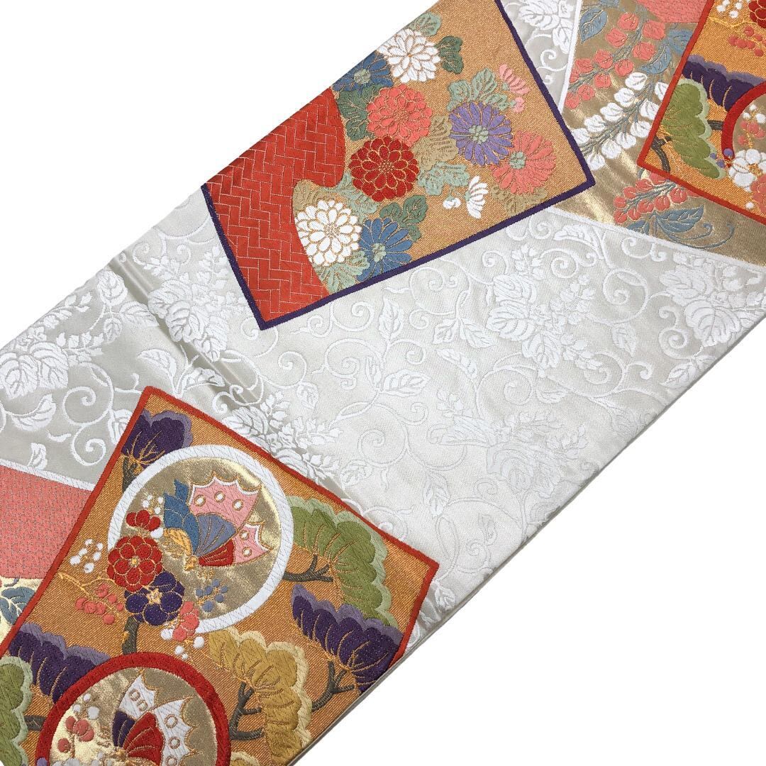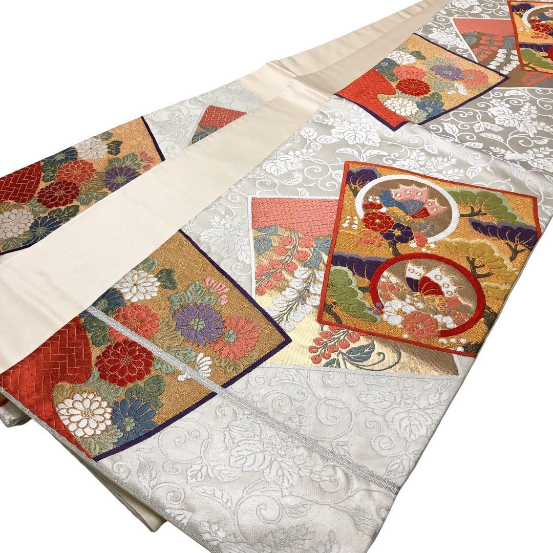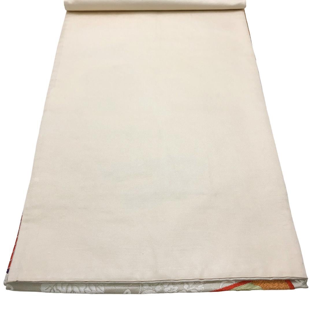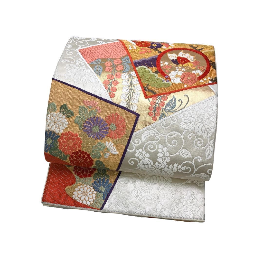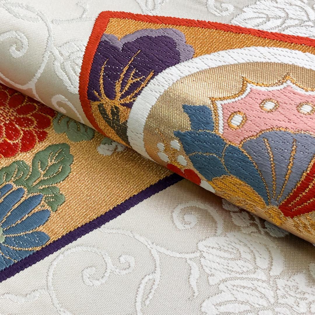 乳白色の上品なお色味に唐草模様、色鮮やかな唐織の色紙に花模様、蝶々の柄行がデザインされた素敵なお品でございます。