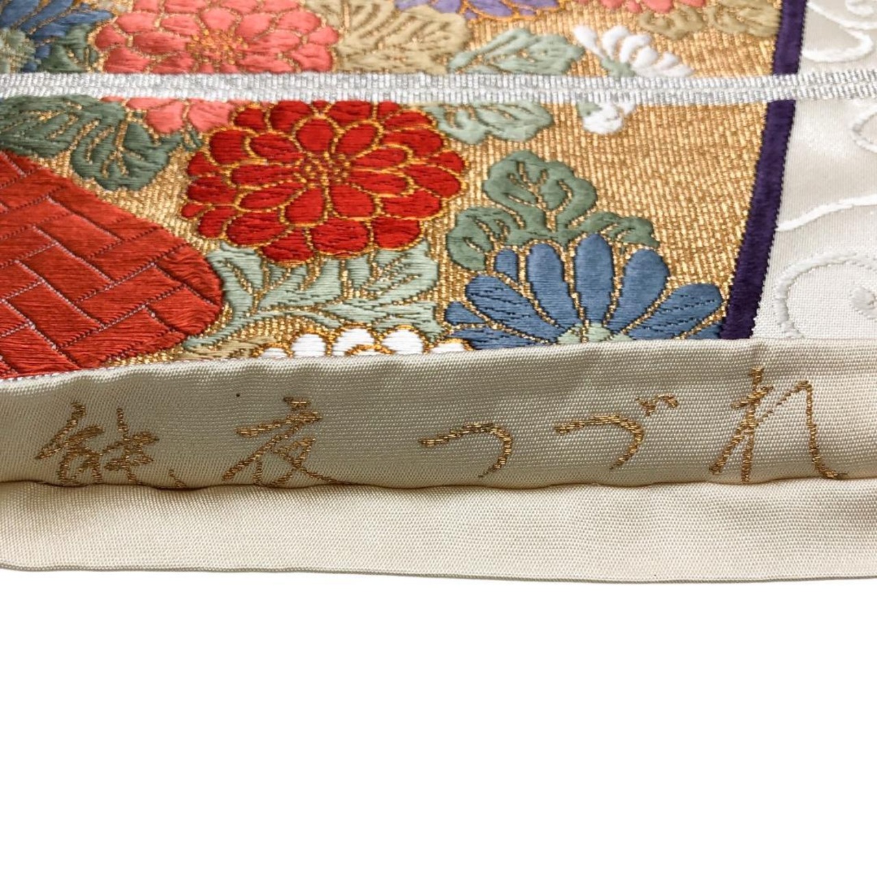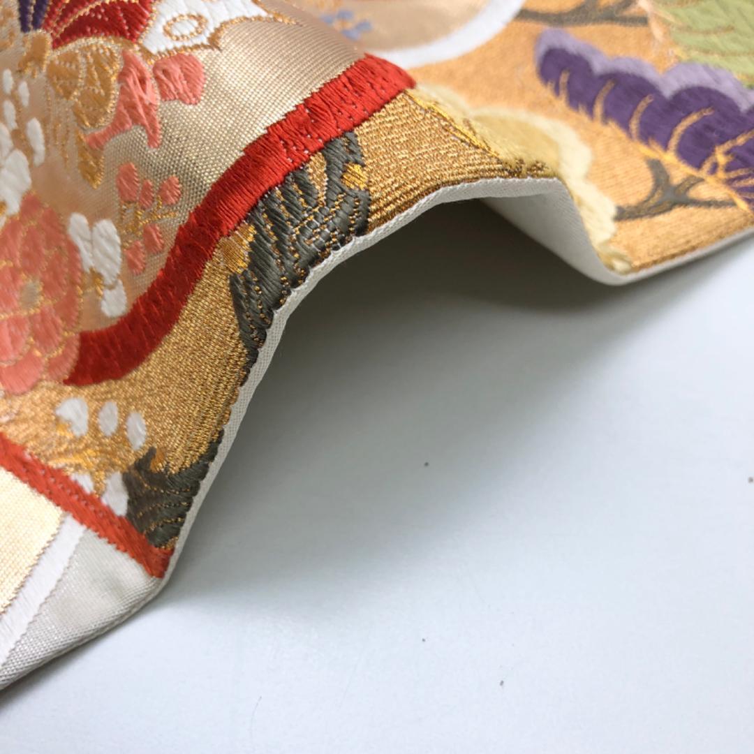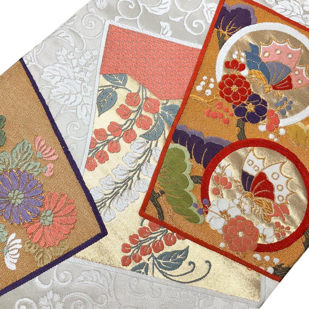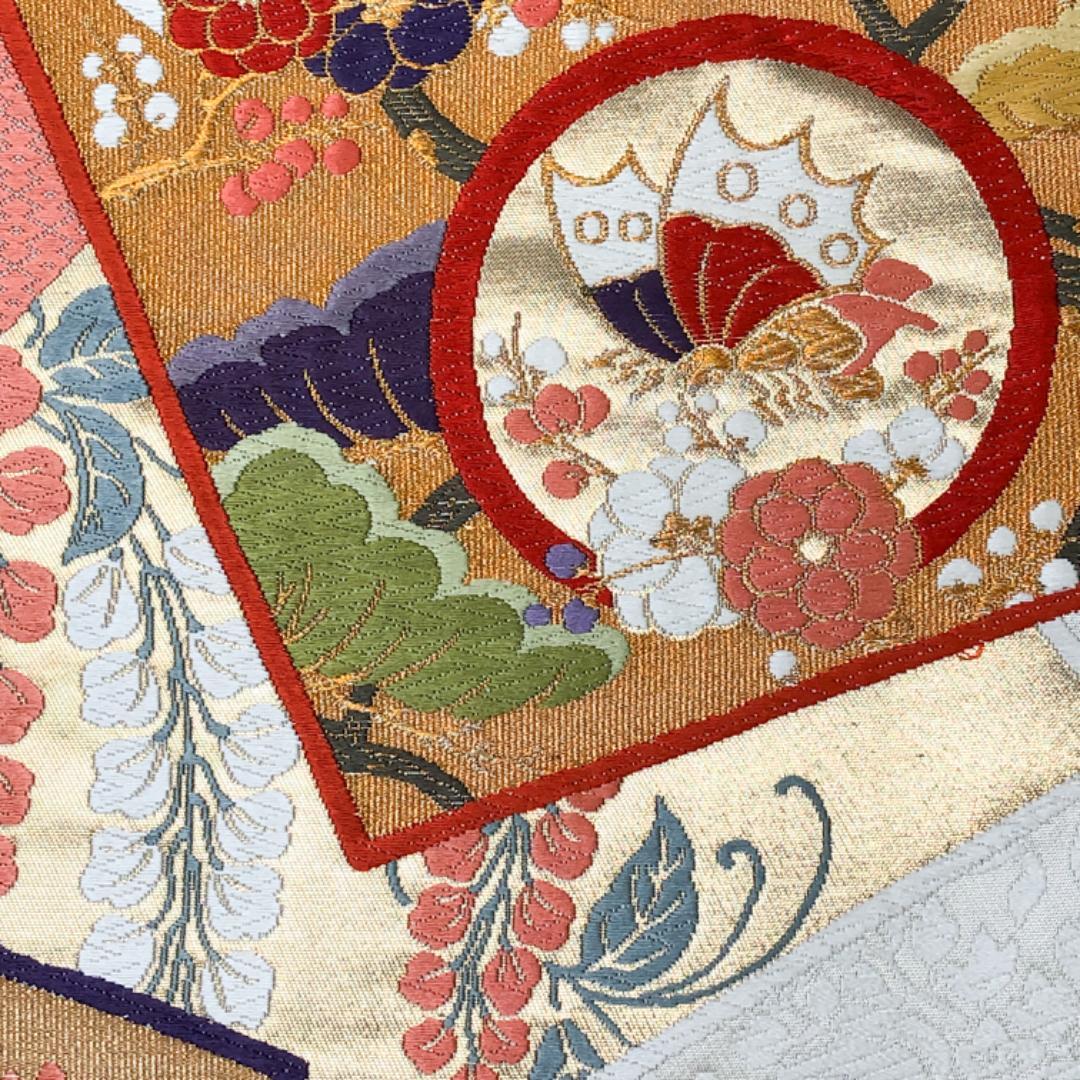 乳白色の上品なお色味に唐草模様、色鮮やかな唐織の色紙に花模様、蝶々の柄行がデザインされた素敵なお品でございます。