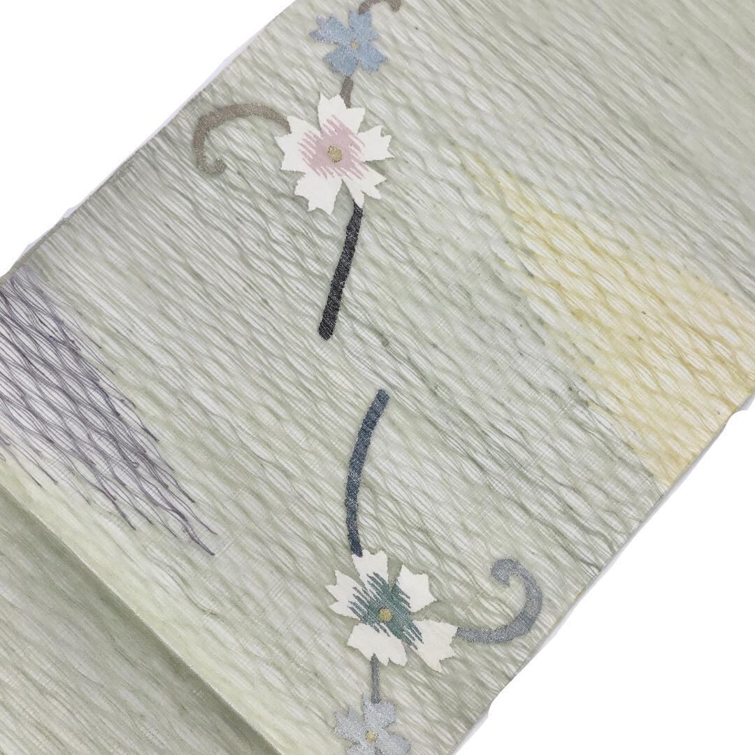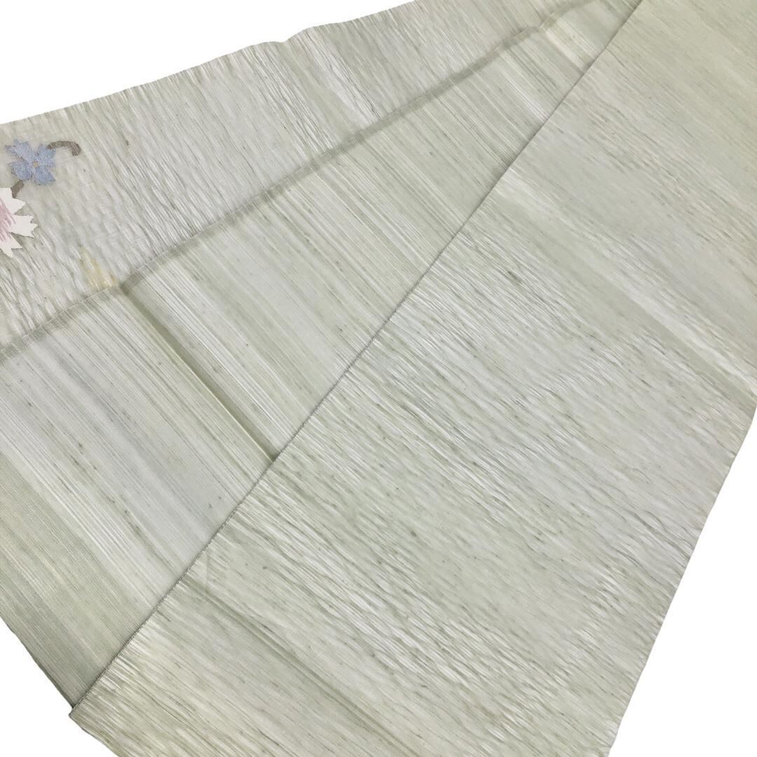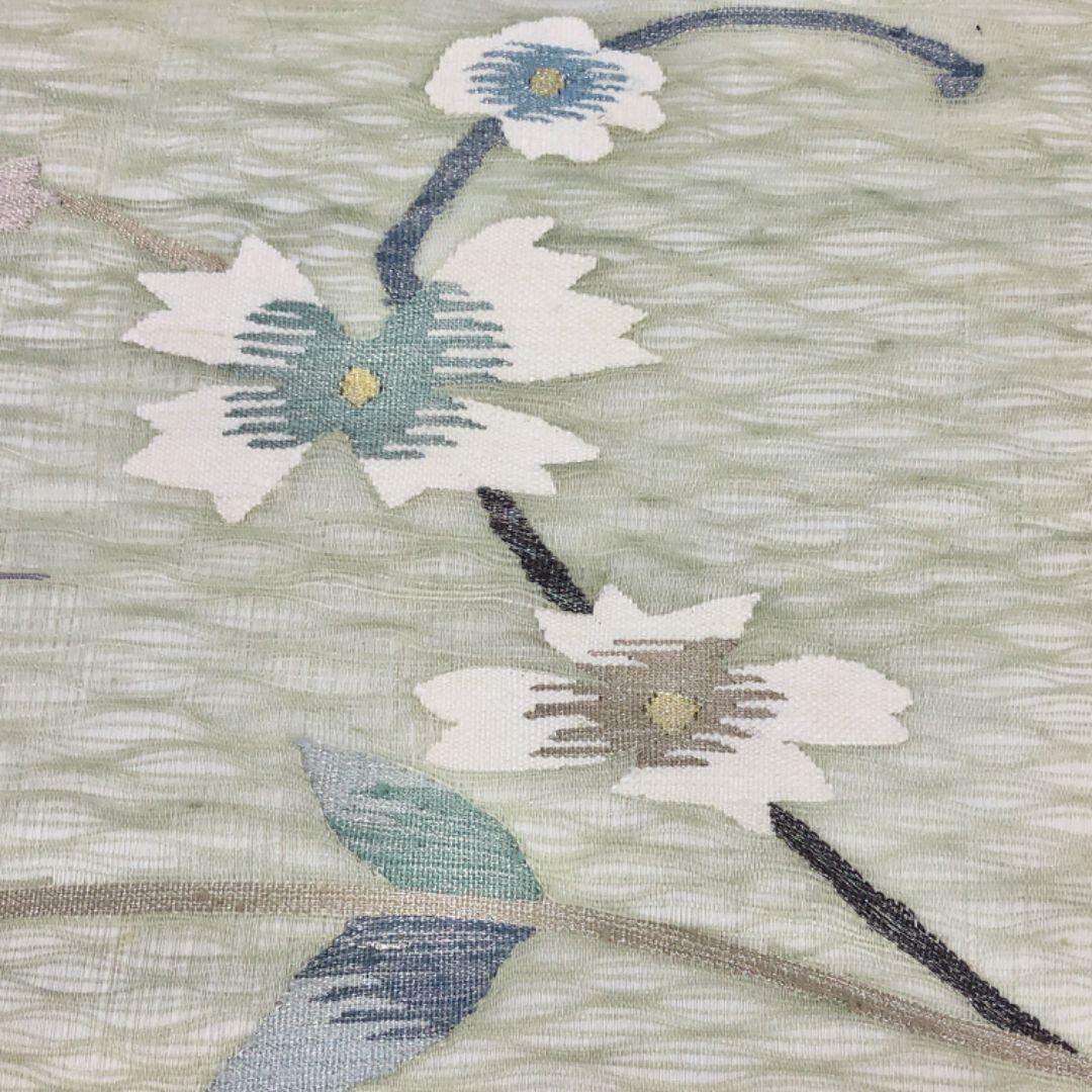 薄緑色ベースの優しいお色味、上品な花模様に夏すくいの透け感のある柄行がデザインされた素敵なお品でございます。