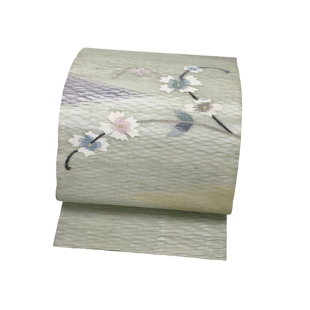 夏帯 袋帯 夏すくい 上品な花模様 銀糸 薄緑色 O-4971 着物 きもの kimono 和服 和装 中古 リサイクル着物 【送料無料】