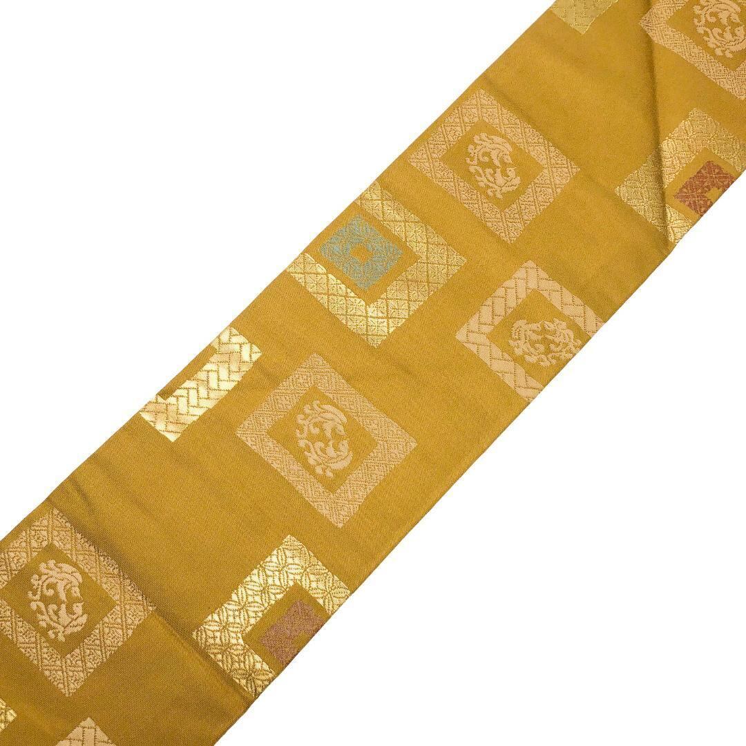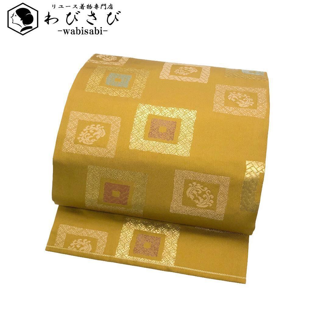 名古屋帯 四角に鳥 花七宝 黄土色 金糸 O-4947 着物 きもの kimono 和服 和装 中古 リサイクル着物 【送料無料】