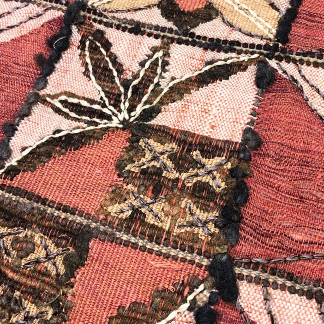暗紅色の落ち着いたお色味の聚蚕紬に四角に雰囲気の良い抽象柄の織模様がデザインされた素敵なお品でございます。