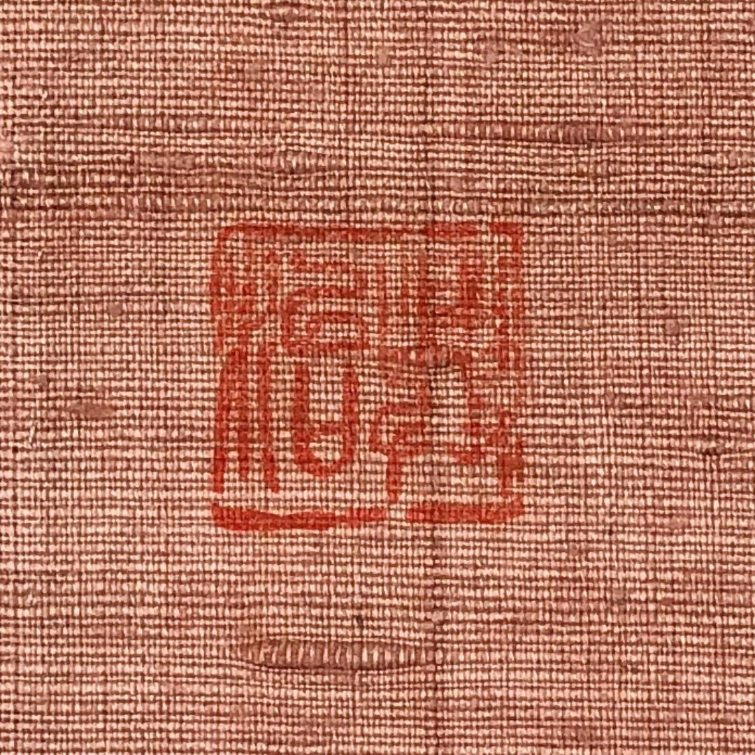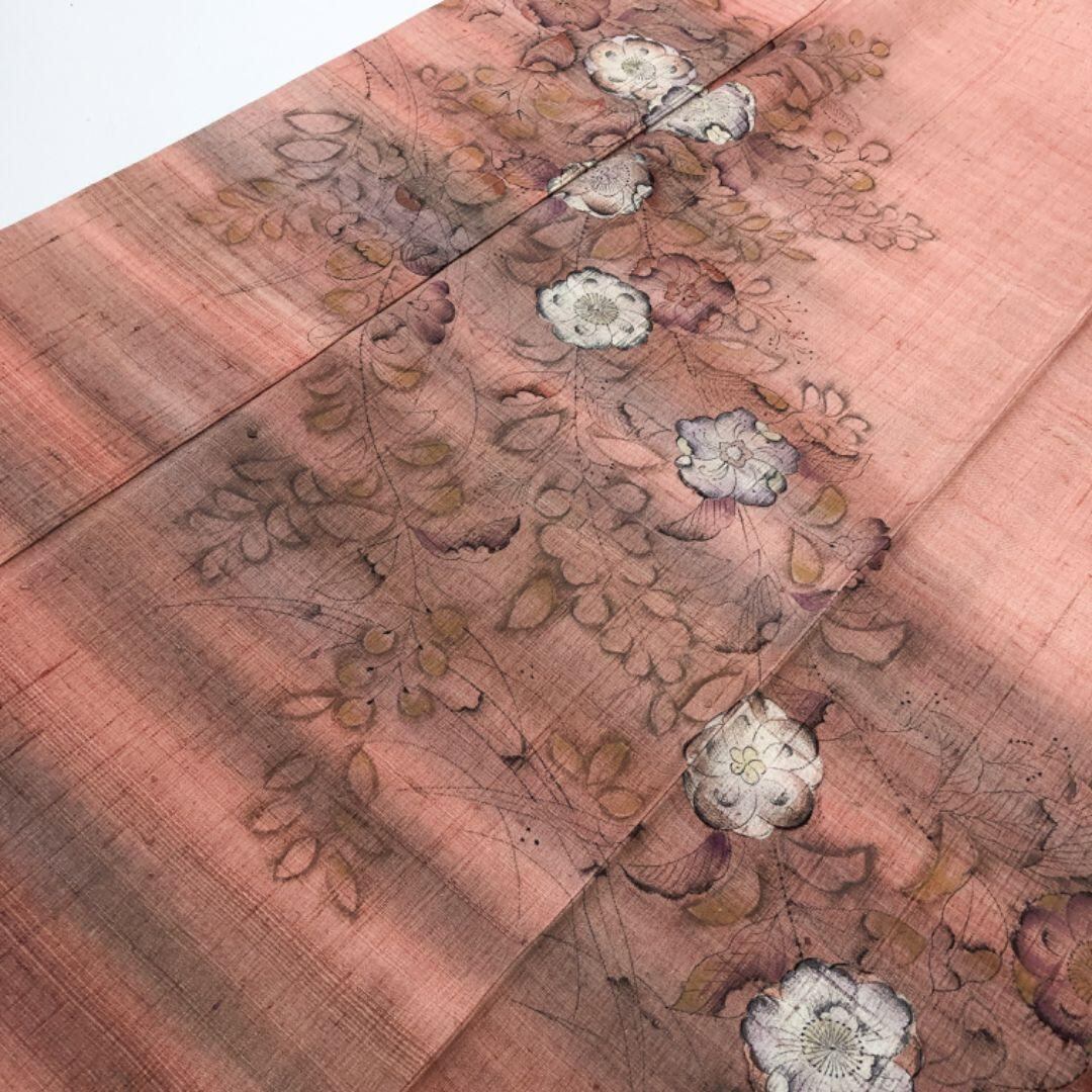 桃染色のお色味の紬地に手描きの美しい辻が花模様の柄裄がデザインされた素敵なお品でございます。