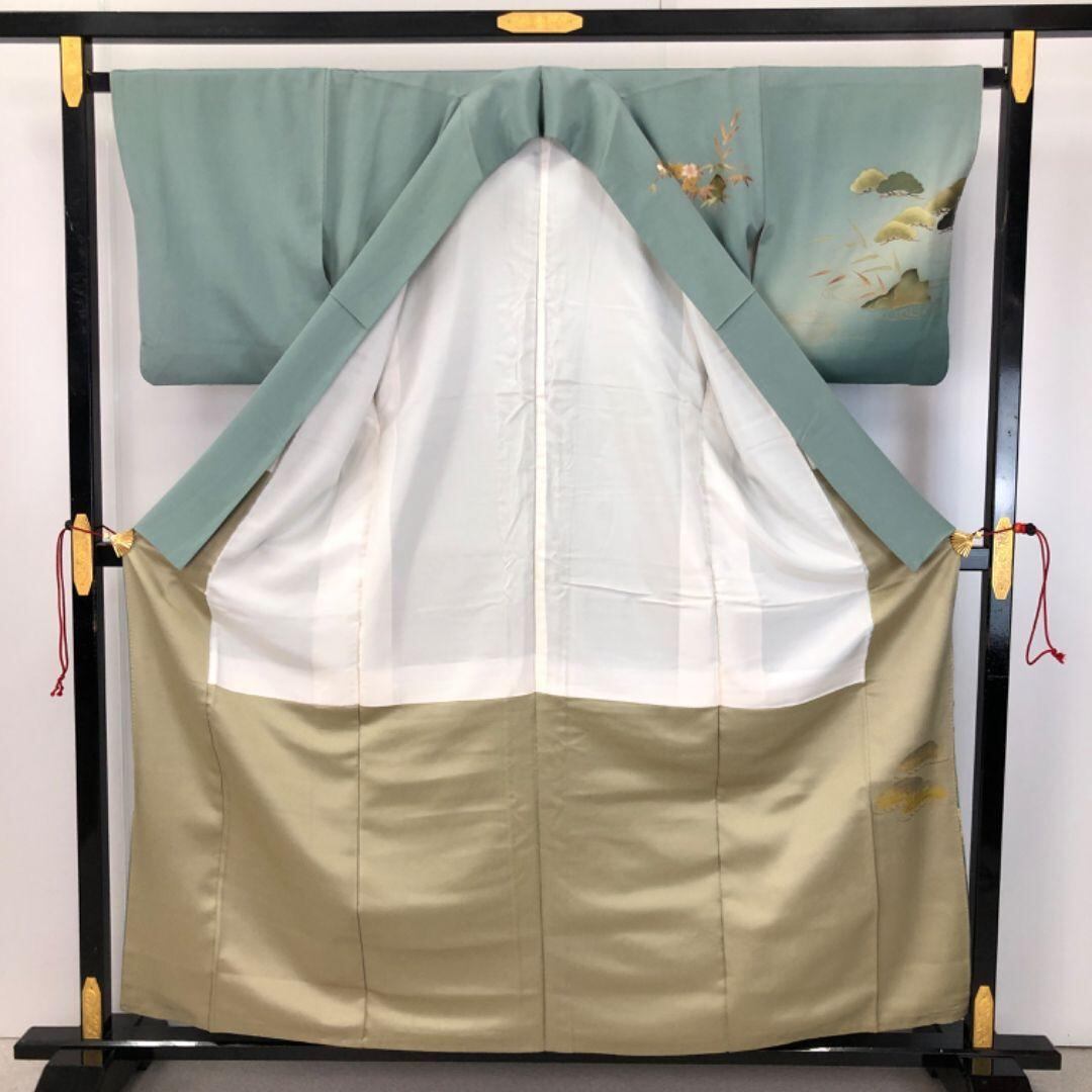 訪問着 螺鈿 鴛鴦に花模様 暈し 深川鼠色 縮緬 金彩 K-4609 着物 きもの kimono 和服 和装 中古 リサイクル着物 【送料無料】