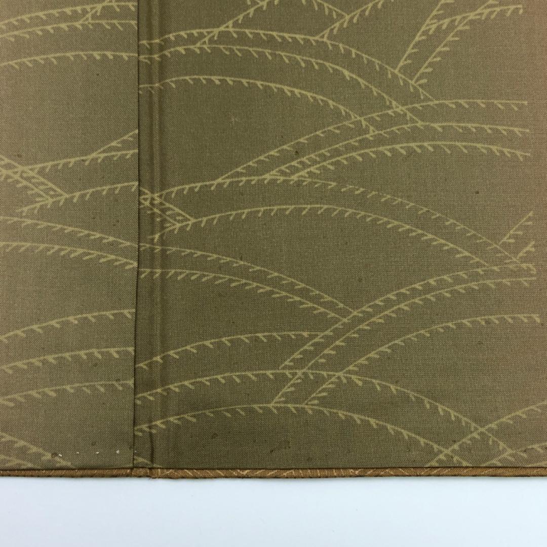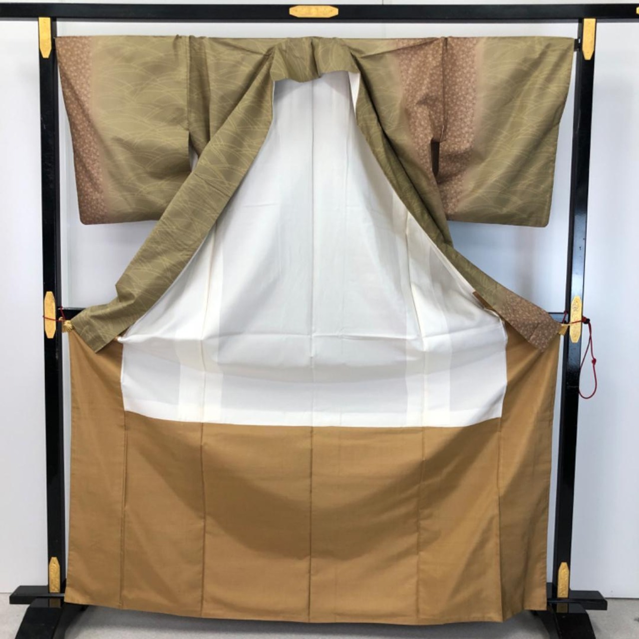 枯草色ベースの落ち着いたお色味、縦縞に小花模様の柄裄がデザインされた素敵なお品でございます。