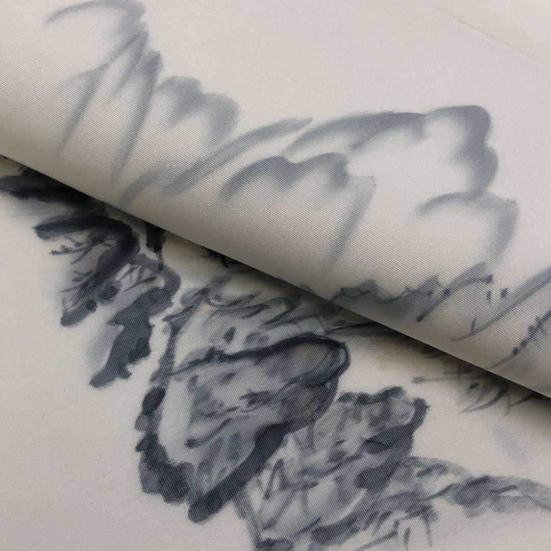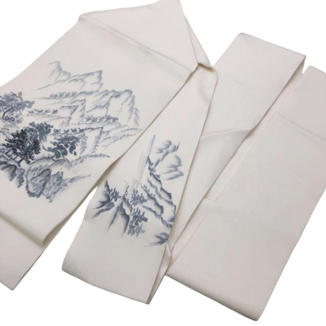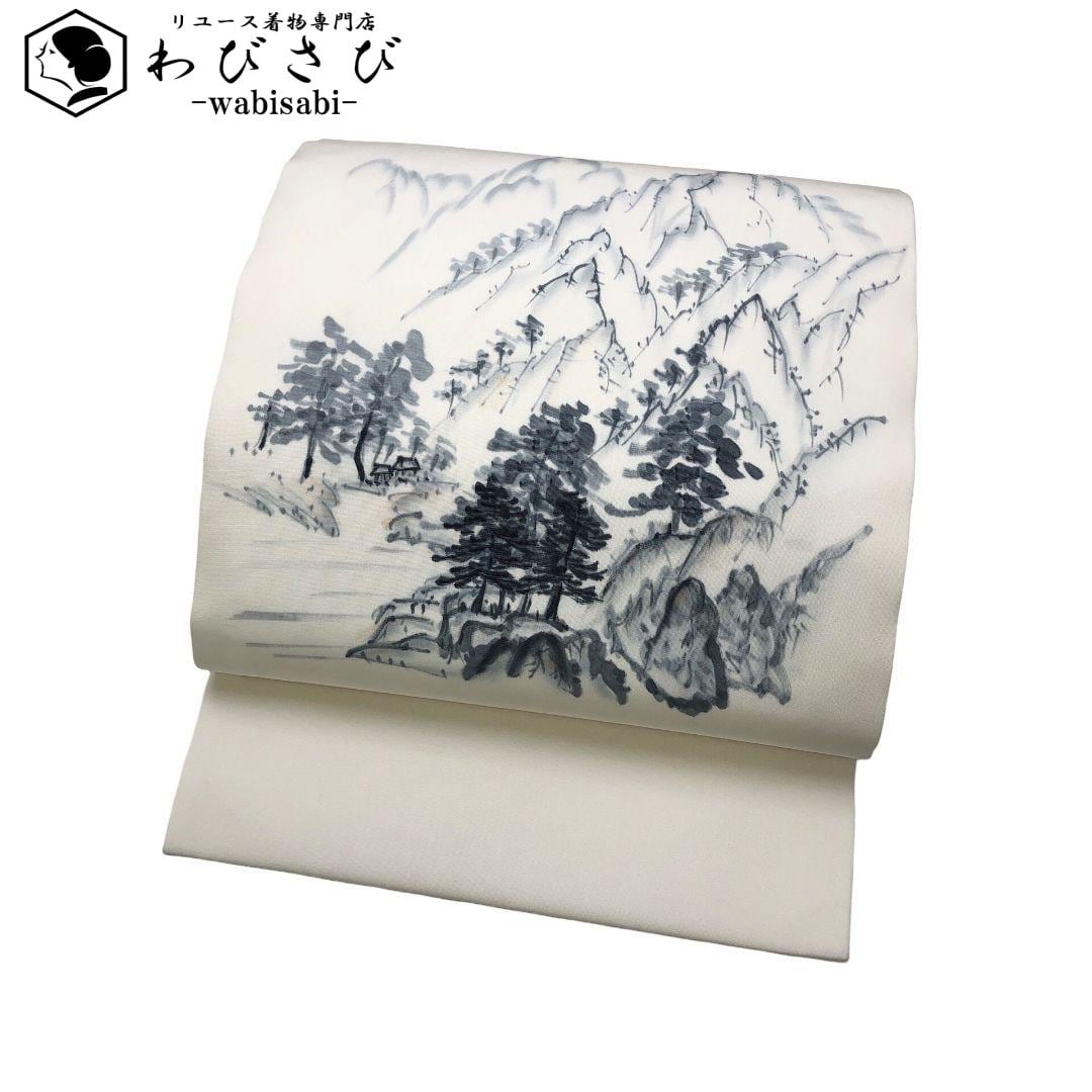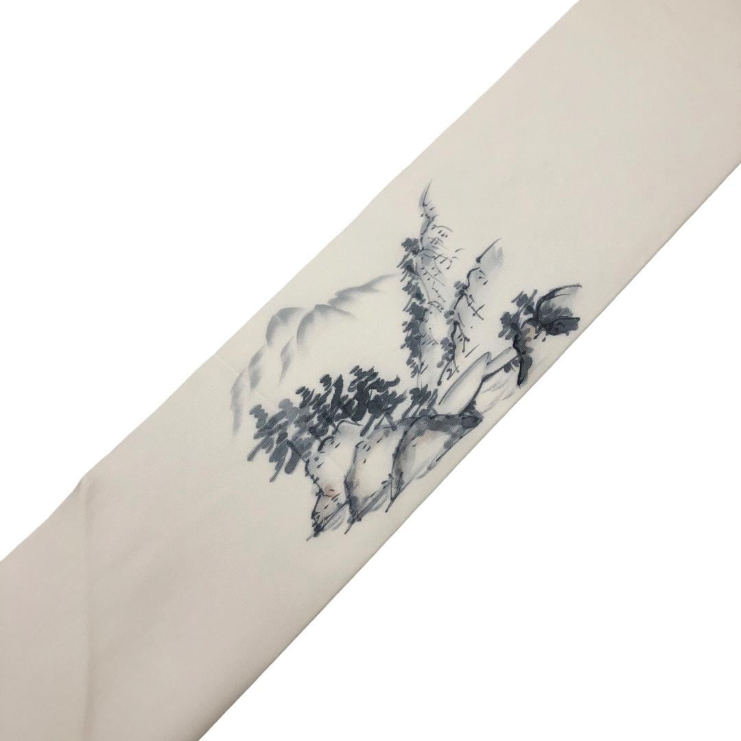 乳白色のお色味の塩瀬、墨描きの風景柄がデザインされた素敵な柄裄のお品でございます。